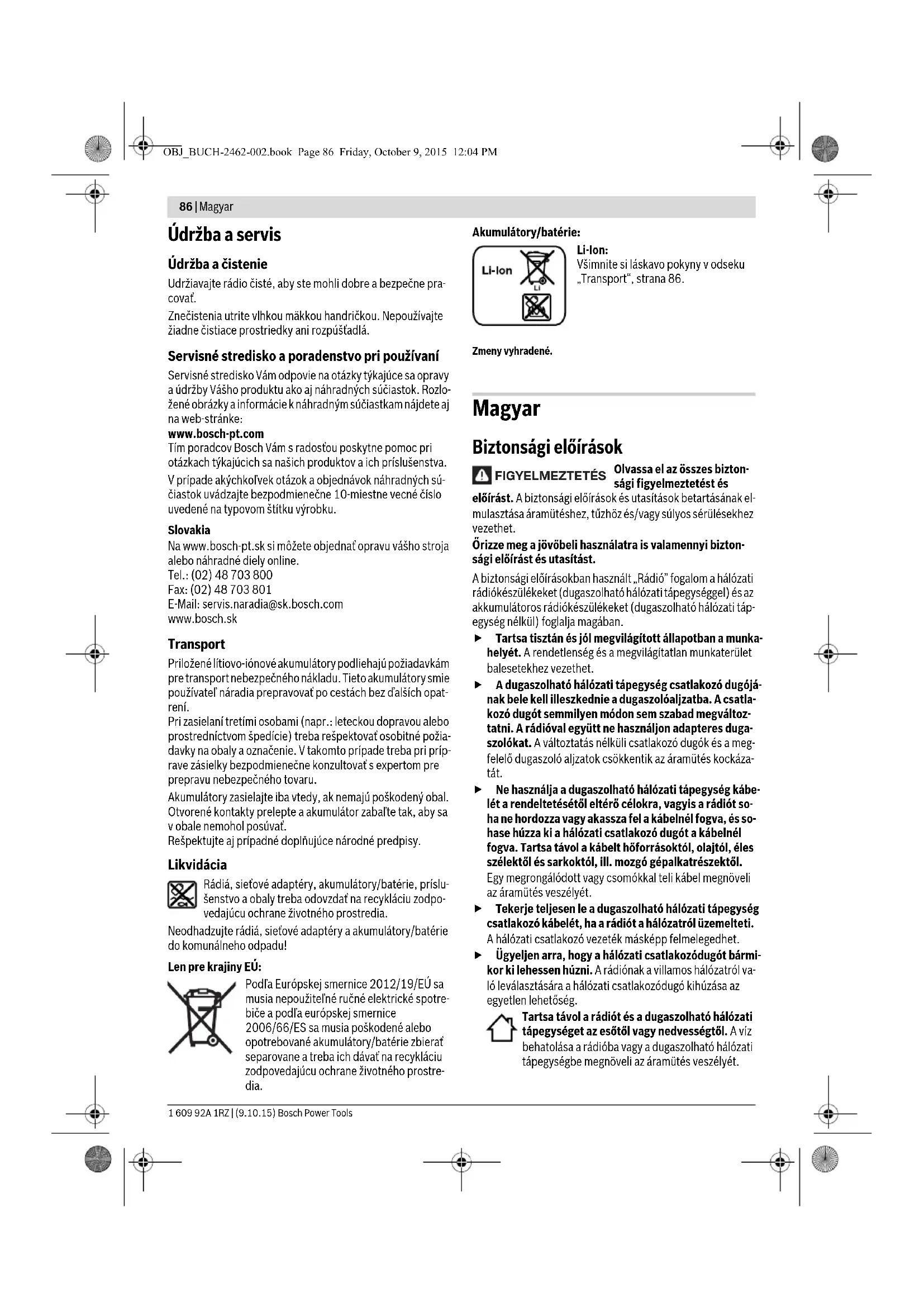 resp. tlačidlo na vyhľadávanie smerom dole 11 a podržte ho krátko stlačené. Frekvencia nájdeného rozhlasového vy- sielača sa zobrazí v indikácii a na displeji. Pri dostatočne silnom príjme vhodného signálu sa rádio auto- maticky prepne na stereopríjem. Na displeji sa objaví indiká- cia pre stereopríjem c. Ak chcete uložiť nastavený vysielač do pamäte, stlačte nie- ktoré tlačidlo na ukladanie programov 9 na dobu 3 sekundy. Len čo sa zobrazí v indikácii e „PR“ a takisto číslo zvoleného tlačidla na ukladanie programov, je vysielač uložený v pamäti. Do pamäte môžete uložiť 5 rozhlasových vysielačov VKV a 5 vysielačov SV. Pamätajte na to, že miesto v pamäti rádio- prijímača, ktoré už bolo obsadené, sa pri novom výbere novo nastaveným rozhlasovým vysielačom prepíše. OBJ_BUCH-2462-002.book Page 84 Friday, October 9, 2015 12:04 PMSlovensky | 85 Bosch Power Tools 1 609 92A 1RZ | (9.10.15) Keď chcete počúvať niektorý vysielač uložený v pamäti, stlačte krátko príslušné tlačidlo na ukladanie programov 9. V indikácii e sa na displeji na niekoľko sekúnd zobrazí „PR“ a ta- kisto číslo pamäte programu. Pripojenie externých audiozdrojov Okrem integrovaného rádioprijímača môžete počúvať repro- dukciu z rôznych externých audiozdrojov. Odoberte ochranný kryt konektora – zdierky „AUX IN“ 22. Zasuňte konektor (džek) 3,5 mm kábla-šnúry 26 do zdierky (pozri obrázok na grafickej strane tohto Návodu). Pripojte druhú zástrčku kábla AUX na nejaký vhodný audiozdroj. Keď chcete počúvať pripojený audiozdroj, stláčajte tlačidlo pre výber audiozdroja „Source“ 14 Keď chcete počúvať pri- pojený audiozdroj, stláčajte tlačidlo pre výber audiozdroja f dovtedy, kým sa na zobrazí displeji „AUX“. Na ochranu proti znečisteniu nasaďte ochranný kryt konekto- ra „AUX IN“ 22 znova, keď ste zástrčku kábla AUX (džek) vy- brali. Indikácia hodinového času Rádio má zobrazenie času so samostatným energetickým na- pájaním. Ak sú v priehradke na batérie vložené vyrovnávacie batérie s dostatočnou kapacitou (pozri „Vkladanie/výmena záložných batérií“, strana 83), čas sa dá uložiť, aj keď je rádio odpojené od energetického napájania z akumulátora alebo keď je sieťový konektor vytiahnutý zo zástrčky. Nastavenie hodinového času – Ak chcete nastaviť hodinový čas, stláčajte tlačidlo na na- stavenie času 10 toľkokrát, kým začne blikať číslo ozna- čujúce hodiny v indikácii času e. – Stlačte tlačidlo na vyhľadávanie smerom hore 12, resp. tlačidlo na vyhľadávanie smerom dole 11 toľko- krát, kým sa na displeji objaví korektná hodinová číslica. – Znova stlačte tlačidlo 10, aby v indikácii e blikalo číslo indikujúce minúty. – Stlačte tlačidlo na vyhľadávanie smerom hore 12, resp. tlačidlo na vyhľadávanie smerom dole 11 toľko- krát, kým sa na displeji objaví korektná minútová číslica. – Stlačte tlačidlo 10 tretíkrát, aby ste uložili nastavený hodinový čas do pamäte. Pokyny na používanie Pokyny pre optimálne zaobchádzanie s akumulátorom Chráňte akumulátor pred vlhkosťou a vodou. Akumulátor skladujte iba pri rozsahu teploty od –20 °C do 50 °C. Nenechávajte napríklad akumulátor v lete položený v automobile. Nový akumulátor alebo akumulátor, ktorý sa dlhší čas nepou- žíval, dáva plný výkon až po cca 5 nabíjacích a vybíjacích cyk- loch. Výrazne skrátená prevádzková doba akumulátora po nabití signalizuje, že akumulátor je opotrebovaný a treba ho vymeniť za nový. Dodržiavajte pokyny na likvidáciu. Poruchy – príčiny a ich odstránenie Ak uvedené postupy nápravy nie sú v stave odstrániť poruchu, skontaktujte sa s autorizovaným servisným strediskom Bosch. Príčina Odstránenie Rádio nefunguje Napájanie elektrickým prú- dom chýba Zasuňte správne zástrčku zá- strčkového sieťového adaptéra a pripojovaciu zá- strčku resp. úplne nabitý aku- mulátor Rádio je príliš teplé alebo stu- dené Počkajte, kým rádio dosiahne prevádzkovú teplotu Rádio nefunguje pri sieťovej prevádzke Poškodený zástrčkový sieťo- vý adaptér alebo pripojovací kábel Skontrolujte zástrčkový sie- ťový adaptér a pripojovací ká- bel a v prípade potreby ich dajte vymeniť Zasunutý nesprávny sieťový adaptér Používajte len originálny zá- strčkový sieťový adaptér Bos- ch (dá sa objednať aj ako náh- radná súčiastka) Rádio nefunguje pri akumulátorovej prevádzke Kontakty akumulátora sú zne- čistené Vyčistite kontakty aku- mulátora; napríklad viacná- sobným zasunutím a vysunu- tím akumulátora, prípadne akumulátor vymeniť za nový Akumulátor je pokazený Akumulátor vymeniť za nový Akumulátor je príliš teplý ale- bo príliš studený Počkajte, kým dosiahne vlo- žený akumulátor prevádzko- vú teplotu Rádio náhle zlyhá Zástrčkový sieťový adaptér alebo akumulátor nie sú správne zasunuté, prípadne nie sú celkom zasunuté Zastrčte zástrčkový sieťový adaptér, resp. akumulátor správne a úplne Rádioprijímač má zlý príjem Rušenie inými elektrickými spotrebičmi alebo následkom nevhodného umiestnenia rá- dia Rádio nainštalujte na inom mieste s lepším príjmom, prí- padne vo väčšej vzdialenosti od iných elektronických za- riadení Hodinový čas sa neukazuje Záložné batérie pre hodiny sú vybité Vymeňte záložné batérie Založné batérie sú vložené pólovo nesprávne Vložte záložné batérie pólovo správne OBJ_BUCH-2462-002.book Page 85 Friday, October 9, 2015 12:04 PM86 | Magyar 1 609 92A 1RZ | (9.10.15) Bosch Power Tools Údržba a servis Údržba a čistenie Udržiavajte rádio čisté, aby ste mohli dobre a bezpečne pra- covať. Znečistenia utrite vlhkou mäkkou handričkou. Nepoužívajte žiadne čistiace prostr