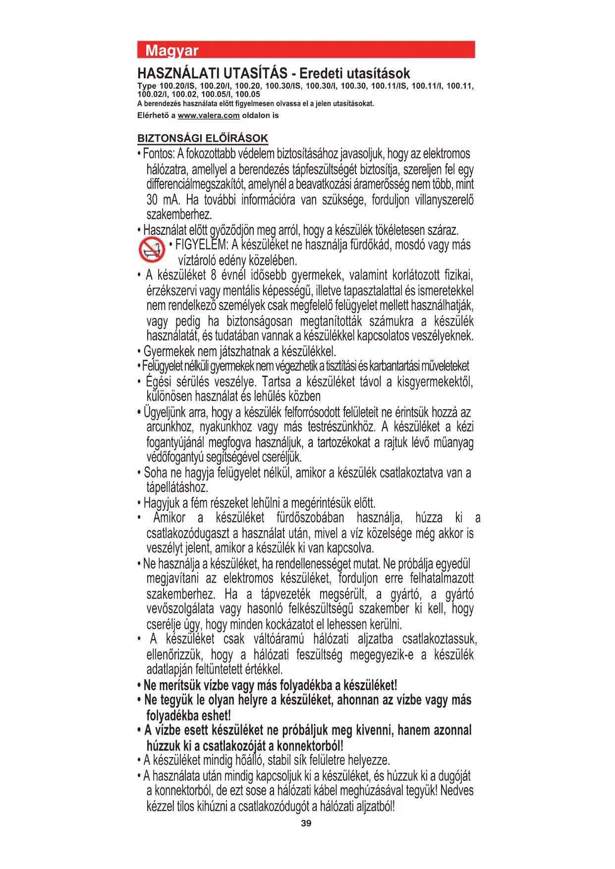 - FIGYELEM: A készüléket ne használja fürdőkád, mosdó vagy más víztároló edény közelében.