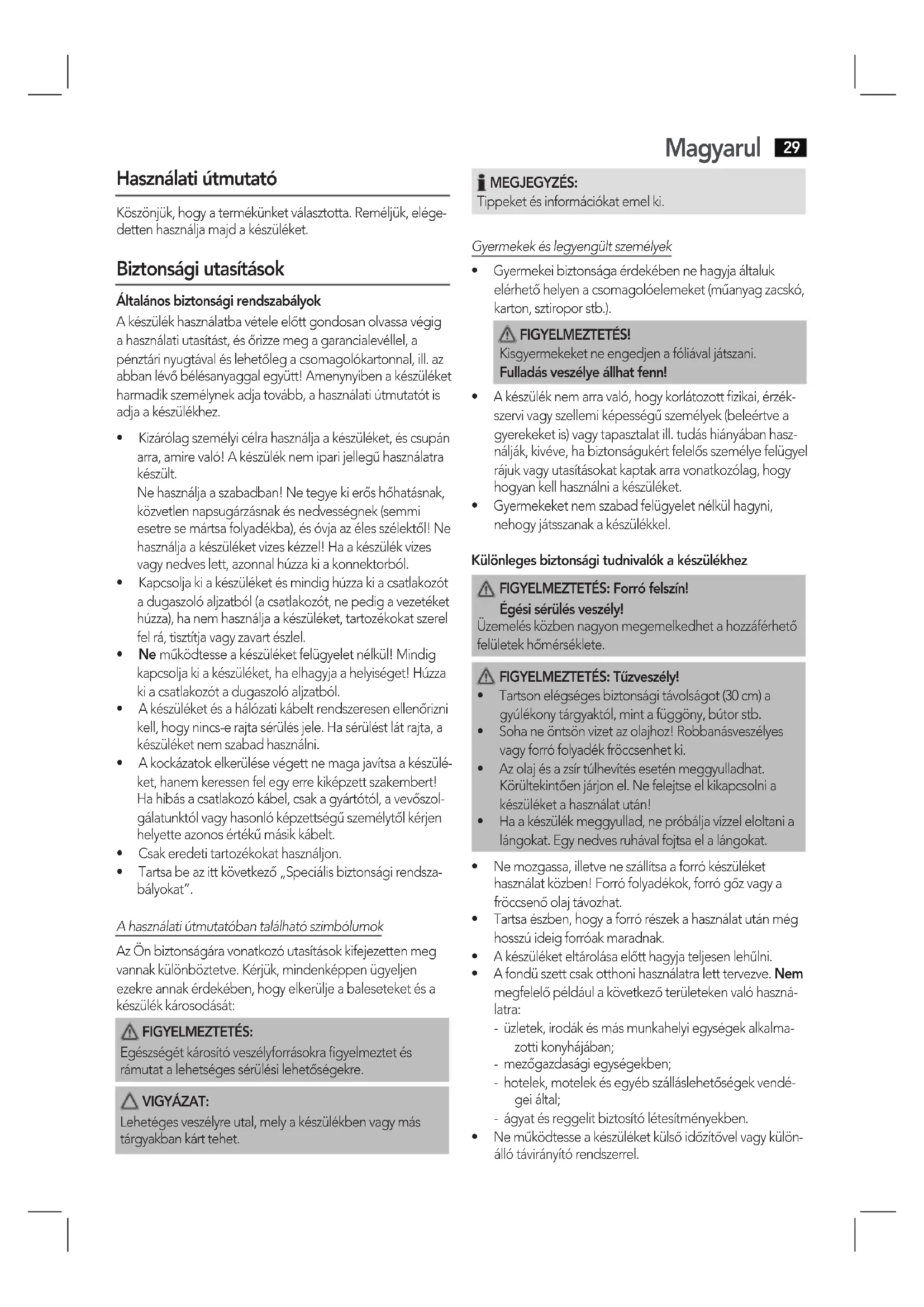 - Gyermekeketnemszabadfelügyeletnélkülhagyni, nehogy játsszanak a készülékkel. Különleges biztonsági tudnivalók a készülékhez FIGYELMEZTETÉS: Forró felszín! Égési sérülés veszély! Üzemelésközbennagyonmegemelkedhetahozzáférhető felületek hőmérséklete. FIGYELMEZTETÉS: Tűzveszély!