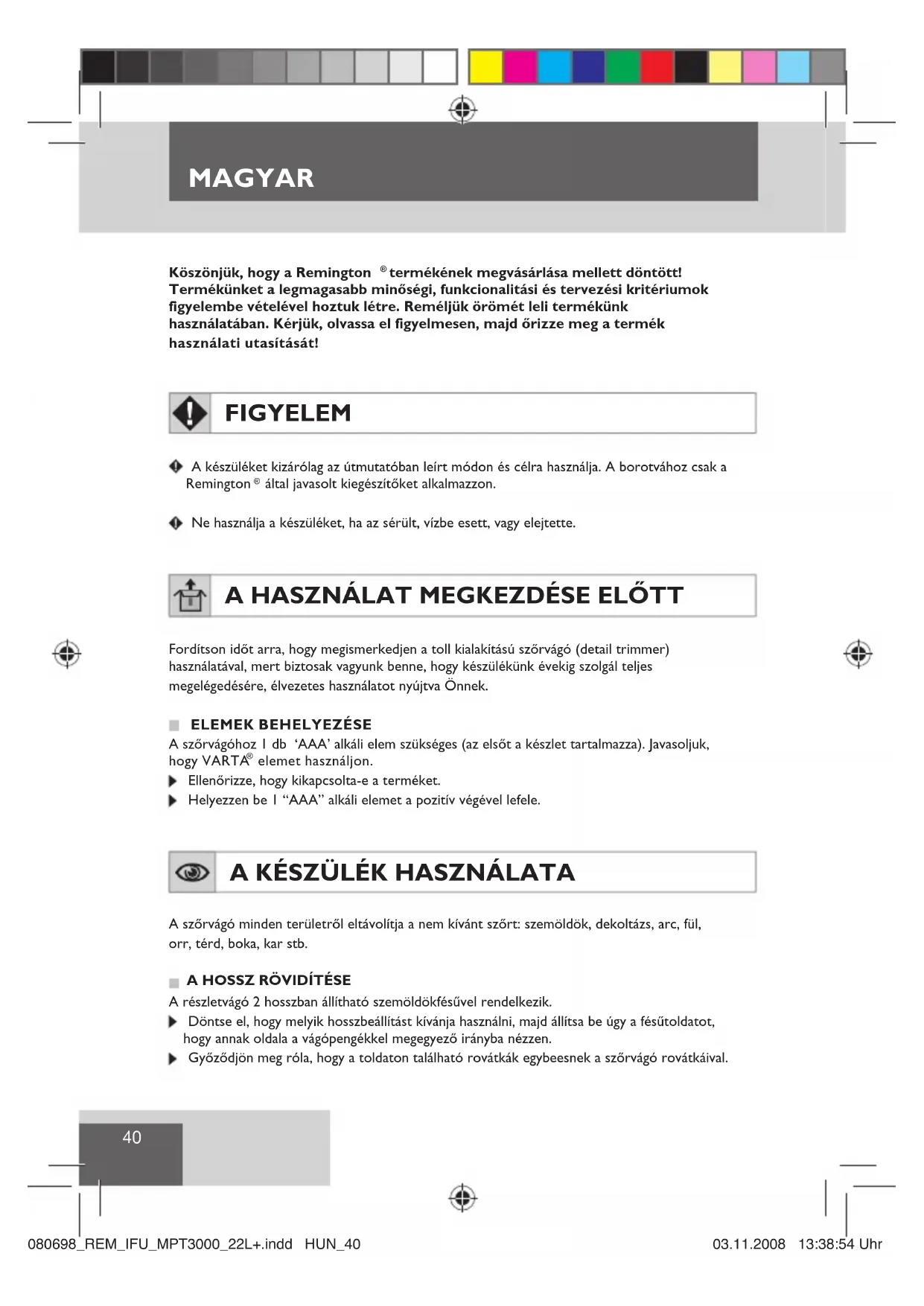 Importőr: Varta Hungária Kft, 1191, Budapest, Ady Endre út 42-44. (ez nem szerviz központ, probléma esetén előzetesen egyeztessen ügyfélszolgálatunkkal) Gyártmány: REMINGTON Jótállási idő: 2 év Eladó szerv által kitöltendő! Forgalmazó neve, címe: Típus: Vásárlás időpontja: 080698_REM_IFU_MPT3000_22L+.indd HUN_42080698_REM_IFU_MPT3000_22L+.indd HUN_42 03.11.2008 13:38:54 Uhr03.11.2008 13:38:54 Uhr43 GBDNLFEIDKSFINPSKCZPL HUN RUTRROGRSLAEHE HR/ SRB