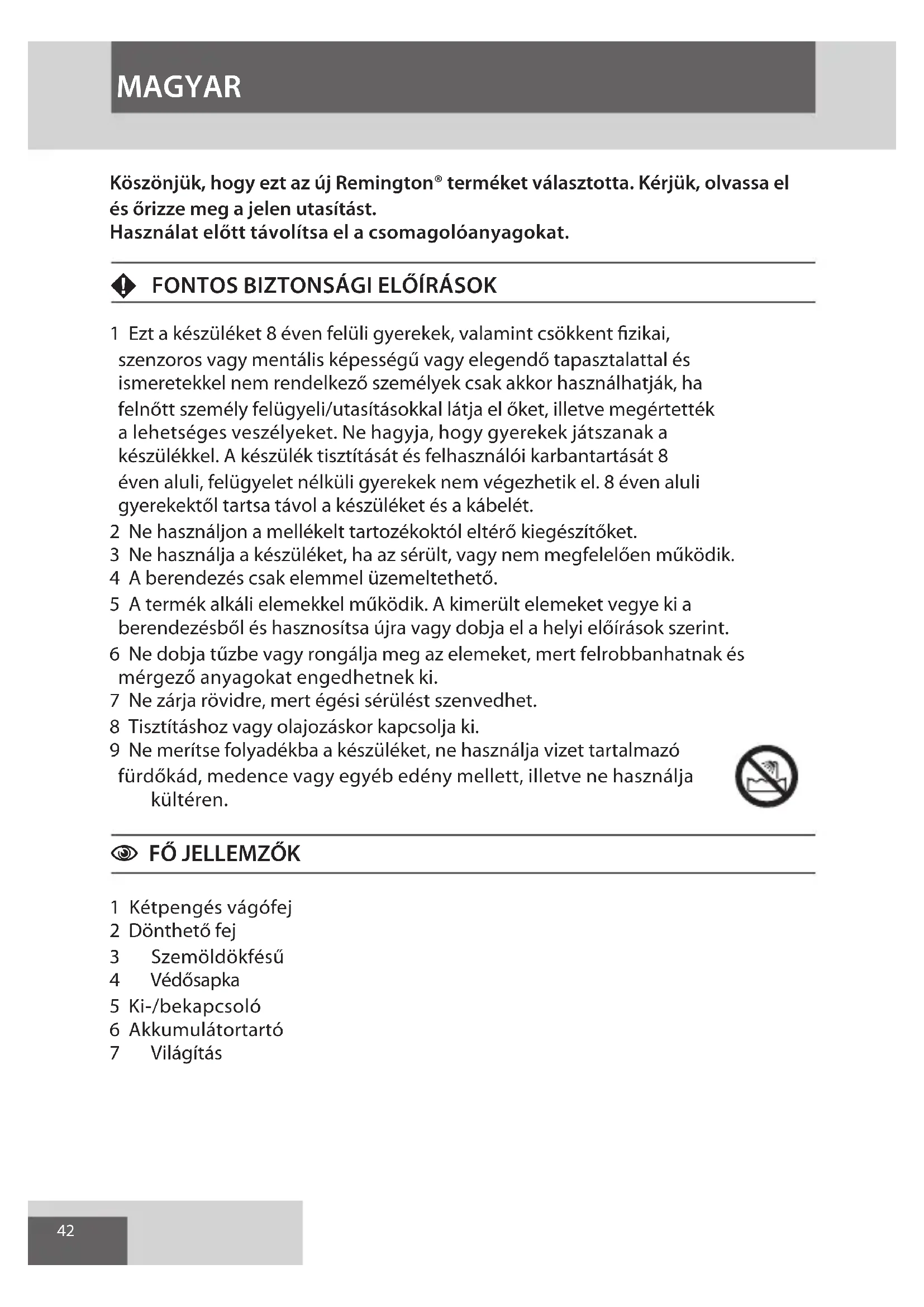 Aby uniknąć zagrożeń dla środowiska i zdrowia ze względu na niebezpieczne substancje znajdujące się w komponentach elektrycznych i elektronicznych, urządzeń oznaczonych tym symbolem nie wyrzucaj wraz z niesortowanymi odpadami komunalnymi - składniki urządzenia mogą być ponownie wykorzystane lub poddane recyklingowi. POLSKI GBDNLFEIDKSFINPSKCZ HUN PLRUTRROGRSLAE HR42 Köszönjük, hogy ezt az új Remington® terméket választotta. Kérjük, olvassa el és őrizze meg a jelen utasítást. Használat előtt távolítsa el a csomagolóanyagokat. F FONTOS BIZTONSÁGI ELŐÍRÁSOK 1 Ezt a készüléket 8 éven felüli gyerekek, valamint csökkent fizikai, szenzoros vagy mentális képességű vagy elegendő tapasztalattal és ismeretekkel nem rendelkező személyek csak akkor használhatják, ha felnőtt személy felügyeli/utasításokkal látja el őket, illetve megértették a lehetséges veszélyeket. Ne hagyja, hogy gyerekek játszanak a készülékkel. A készülék tisztítását és felhasználói karbantartását 8 éven aluli, felügyelet nélküli gyerekek nem végezhetik el. 8 éven aluli gyerekektől tartsa távol a készüléket és a kábelét. 2 Ne használjon a mellékelt tartozékoktól eltérő kiegészítőket. 3 Ne használja a készüléket, ha az sérült, vagy nem megfelelően működik. 4 A berendezés csak elemmel üzemeltethető. 5 A termék alkáli elemekkel működik. A kimerült elemeket vegye ki a berendezésből és hasznosítsa újra vagy dobja el a helyi előírások szerint. 6 Ne dobja tűzbe vagy rongálja meg az elemeket, mert felrobbanhatnak és mérgező anyagokat engedhetnek ki. 7 Ne zárja rövidre, mert égési sérülést szenvedhet. 8 Tisztításhoz vagy olajozáskor kapcsolja ki. 9 Ne merítse folyadékba a készüléket, ne használja vizet tartalmazó fürdőkád, medence vagy egyéb edény mellett, illetve ne használja kültéren.