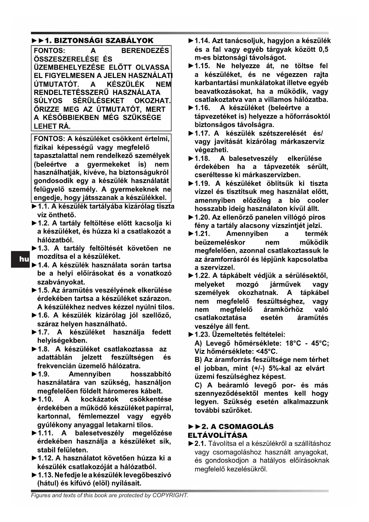 A KÉSŐBBIEKBEN MÉG SZÜKSÉGE LEHET RÁ. FONTOS: A készüléket csökkent értelmi, zikai képességű vagy megfelelő tapasztalattal nem rendelkező személyek (beleértve a gyermekeket is) nem használhatják, kivéve, ha biztonságukról gondosodik egy a készülék használatát felügyelő személy. A gyermekeknek ne engedje, hogy játsszanak a készülékkel. ►1.1. A készülék tartályába kizárólag tiszta víz önthető. ►1.2. A tartály feltöltése előtt kacsolja ki a készüléket, és húzza ki a csatlakozót a hálózatból. ►1.3. A tartály feltöltését követően ne mozdítsa el a készüléket. ►1.4. A készülék használata során tartsa be a helyi előírásokat és a vonatkozó szabványokat. ►1.5. Az áramütés veszélyének elkerülése érdekében tartsa a készüléket szárazon. A készülékhez nedves kézzel nyúlni tilos. ►1.6. A készülék kizárólag jól szellőző, száraz helyen használható. ►1.7. A készüléket használja fedett helyiségekben. ►1.8. A készüléket csatlakoztassa az adattáblán jelzett feszültségen és frekvencián üzemelő hálózatra. ►1.9. Amennyiben hosszabbító használatára van szükség, használjon megfelelően földelt háromeres kábelt. ►1.10. A kockázatok csökkentése érdekében a működő készüléket papírral, kartonnal, fémlemezzel vagy egyéb gyúlékony anyaggal letakarni tilos. ►1.11. A balesetveszély megelőzése érdekében használja a készüléket sík, stabil felületen. ►1.12. A használatot követően húzza ki a készülék csatlakozóját a hálózatból. ►1.13. Ne fedje le a készülék levegőbeszívó (hátul) és kifúvó (elöl) nyílásait. ►1.14. Azt tanácsoljuk, hagyjon a készülék és a fal vagy egyéb tárgyak között 0,5 m-es biztonsági távolságot. ►1.15. Ne helyezze át, ne töltse fel a készüléket, és ne végezzen rajta karbantartási munkálatokat illetve egyéb beavatkozásokat, ha a működik, vagy csatlakoztatva van a villamos hálózatba. ►1.16. A készüléket (beleértve a tápvezetéket is) helyezze a hőforrásoktól biztonságos távolságra. ►1.17. A készülék szétszerelését és/ vagy javítását kizárólag márkaszerviz végezheti. ►1.18. A balesetveszély elkerülése érdekében ha a tápvezeték sérült, cseréltesse ki márkaszervizben. ►1.19. A készüléket öblítsük ki tiszta vízzel és tisztítsuk meg használat előtt, amennyiben előzőleg a bio cooler hosszabb ideig használaton kívül állt. ►1.20. Az ellenőrző panelen villógó piros fény a tartály alacsony vízszintjét jelzi. ►1.21. Amennyiben a termék beüzemeléskor nem működik megfelelően, azonnal csatlakoztassuk le az áramforrásról és lépjünk kapcsolatba a szervizzel. ►1.22. A tápkábelt védjük a sérülésektől, melyeket mozgó járművek vagy személyek okozhatnak. A tápkábel nem megfelelő feszültséghez, vagy nem megfelelő áramkörhöz való csatlakoztatása esetén áramütés veszélye áll fent. ►1.23. Üzemeltetés feltételei: A) Levegő hőmérséklete: 18°C - 45°C; Víz hőmérséklete: <45°C. B) Az áramforrás feszültsége nem térhet el jobban, mint (+/-) 5%-kal az elvárt üzemi feszülséghez képest. C) A beáramló levegő por- és más szennyeződésektől mentes kell hogy legyen. Szükség esetén alkalmazzunk további szűrőket.