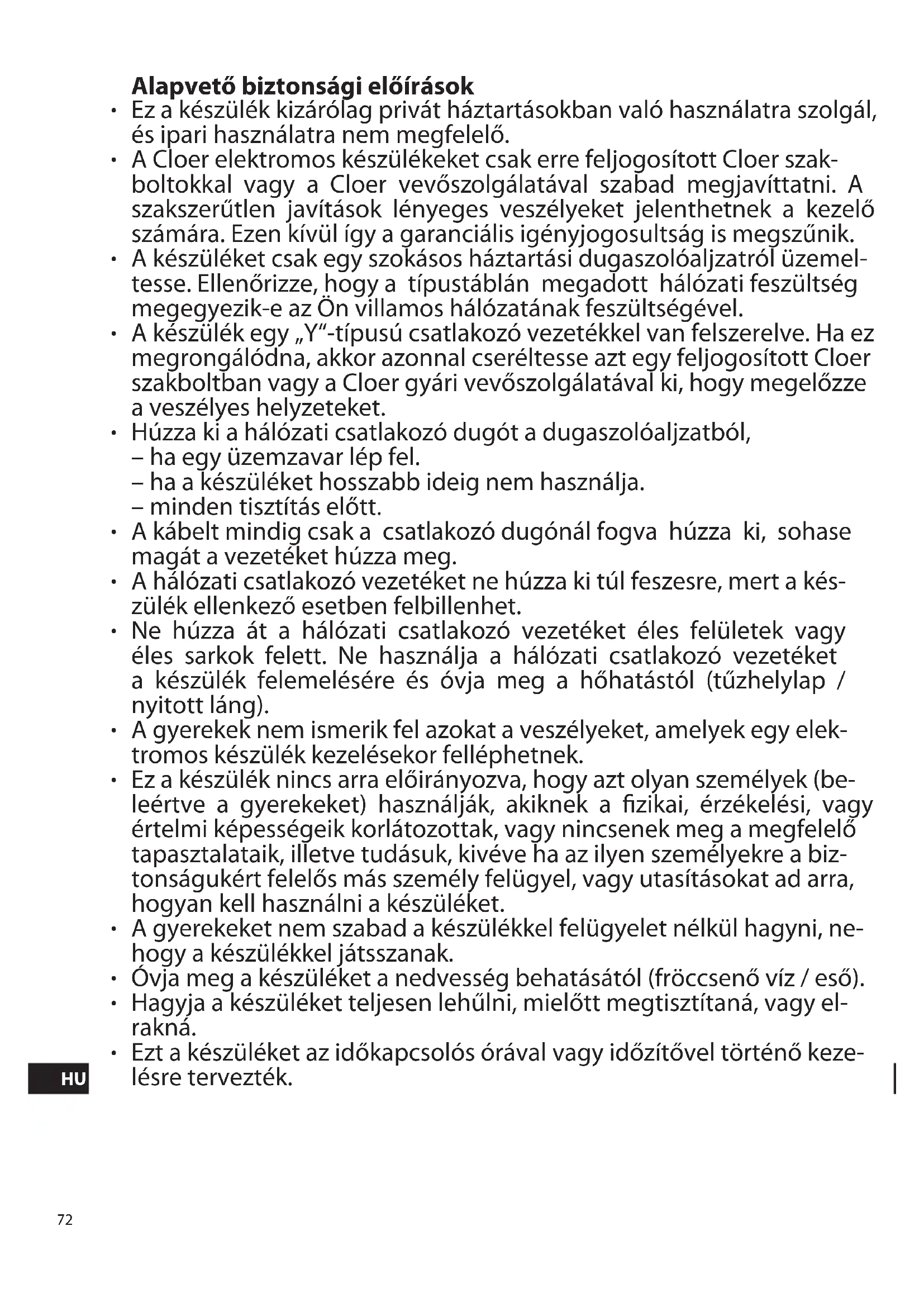 RU72 Alapvető biztonsági előírások Ez a készülék kizárólag privát háztartásokban való használatra szolgál, és ipari használatra nem megfelelő. A Cloer elektromos készülékeket csak erre feljogosított Cloer szak- boltokkal vagy a Cloer vevőszolgálatával szabad megjavíttatni. A szakszerűtlen javítások lényeges veszélyeket jelenthetnek a kezelő számára. Ezen kívül így a garanciális igényjogosultság is megszűnik. A készüléket csak egy szokásos háztartási dugaszolóaljzatról üzemel- tesse. Ellenőrizze, hogy a típustáblán megadott hálózati feszültség megegyezik-e az Ön villamos hálózatának feszültségével. A készülék egy „Y“-típusú csatlakozó vezetékkel van felszerelve. Ha ez megrongálódna, akkor azonnal cseréltesse azt egy feljogosított Cloer szakboltban vagy a Cloer gyári vevőszolgálatával ki, hogy megelőzze a veszélyes helyzeteket. Húzza ki a hálózati csatlakozó dugót a dugaszolóaljzatból, – ha egy üzemzavar lép fel. – ha a készüléket hosszabb ideig nem használja. – minden tisztítás előtt. A kábelt mindig csak a csatlakozó dugónál fogva húzza ki, sohase magát a vezetéket húzza meg. A hálózati csatlakozó vezetéket ne húzza ki túl feszesre, mert a kés- zülék ellenkező esetben felbillenhet. Ne húzza át a hálózati csatlakozó vezetéket éles felületek vagy éles sarkok felett. Ne használja a hálózati csatlakozó vezetéket a készülék felemelésére és óvja meg a hőhatástól (tűzhelylap / nyitott láng). A gyerekek nem ismerik fel azokat a veszélyeket, amelyek egy elek- tromos készülék kezelésekor felléphetnek. Ez a készülék nincs arra előirányozva, hogy azt olyan személyek (be- leértve a gyerekeket) használják, akiknek a zikai, érzékelési, vagy értelmi képességeik korlátozottak, vagy nincsenek meg a megfelelő tapasztalataik, illetve tudásuk, kivéve ha az ilyen személyekre a biz- tonságukért felelős más személy felügyel, vagy utasításokat ad arra, hogyan kell használni a készüléket. A gyerekeket nem szabad a készülékkel felügyelet nélkül hagyni, ne- hogy a készülékkel játsszanak. Óvja meg a készüléket a nedvesség behatásától (fröccsenő víz / eső). Hagyja a készüléket teljesen lehűlni, mielőtt megtisztítaná, vagy el- rakná. Ezt a készüléket az időkapcsolós órával vagy időzítővel történő keze- lésre tervezték.