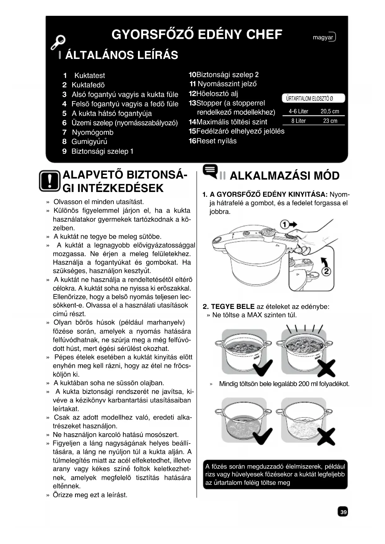 ŮRTARTALOM ELOSZTÓ Ø4-6 Liter8 Liter20,5 cm23 cm » Olvasson el minden utasítást. » Különös gyelemmel járjon el, ha a kukta használatakor gyermekek tartózkodnak a kö- zelben. » A kuktát ne tegye be meleg sütõbe. » A kuktát a legnagyobb elõvigyázatossággal mozgassa. Ne érjen a meleg felületekhez. Használja a fogantyúkat és gombokat. Ha szükséges, használjon kesztyůt. » A kuktát ne használja a rendeltetésétõl eltérõ célokra. A kuktát soha ne nyissa ki erõszakkal. Ellenõrizze, hogy a belsõ nyomás teljesen lec- sökkent-e. Olvassa el a használati utasítások címů részt. » Olyan bõrös húsok (például marhanyelv) fõzése során, amelyek a nyomás hatására felfúvódhatnak, ne szúrja meg a még felfúvó- dott húst, mert égési sérülést okozhat. » Pépes ételek esetében a kuktát kinyitás elõtt enyhén meg kell rázni, hogy az étel ne fröcs- köljön ki. » A kuktában soha ne süssön olajban. » A kukta biztonsági rendszerét ne javítsa, ki- véve a kézikönyv karbantartási utasításaiban leírtakat. » Csak az adott modellhez való, eredeti alka- trészeket használjon. » Ne használjon karcoló hatású mosószert. » Figyeljen a láng nagyságának helyes beállí- tására, a láng ne nyúljon túl a kukta alján. A túlmelegítés miatt az acél elfeketedhet, illetve arany vagy kékes színě foltok keletkezhet- nek, amelyek megfelelõ tisztítás hatására eltěnnek. » Õrizze meg ezt a leírást. ALAPVETÕ BIZTONSÁ-