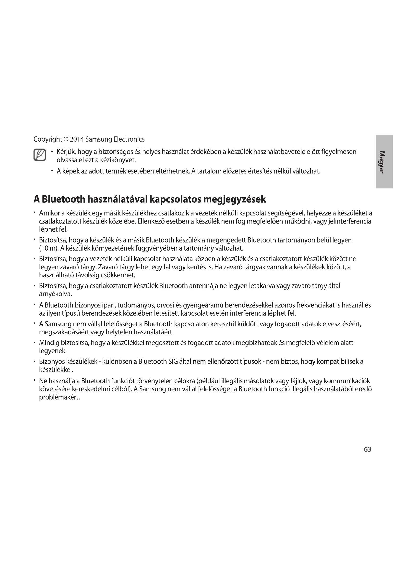 A Samsung nem vállal felelősséget a Bluetooth kapcsolaton keresztül küldött vagy fogadott adatok elvesztéséért, megszakadásáért vagy helytelen használatáért.