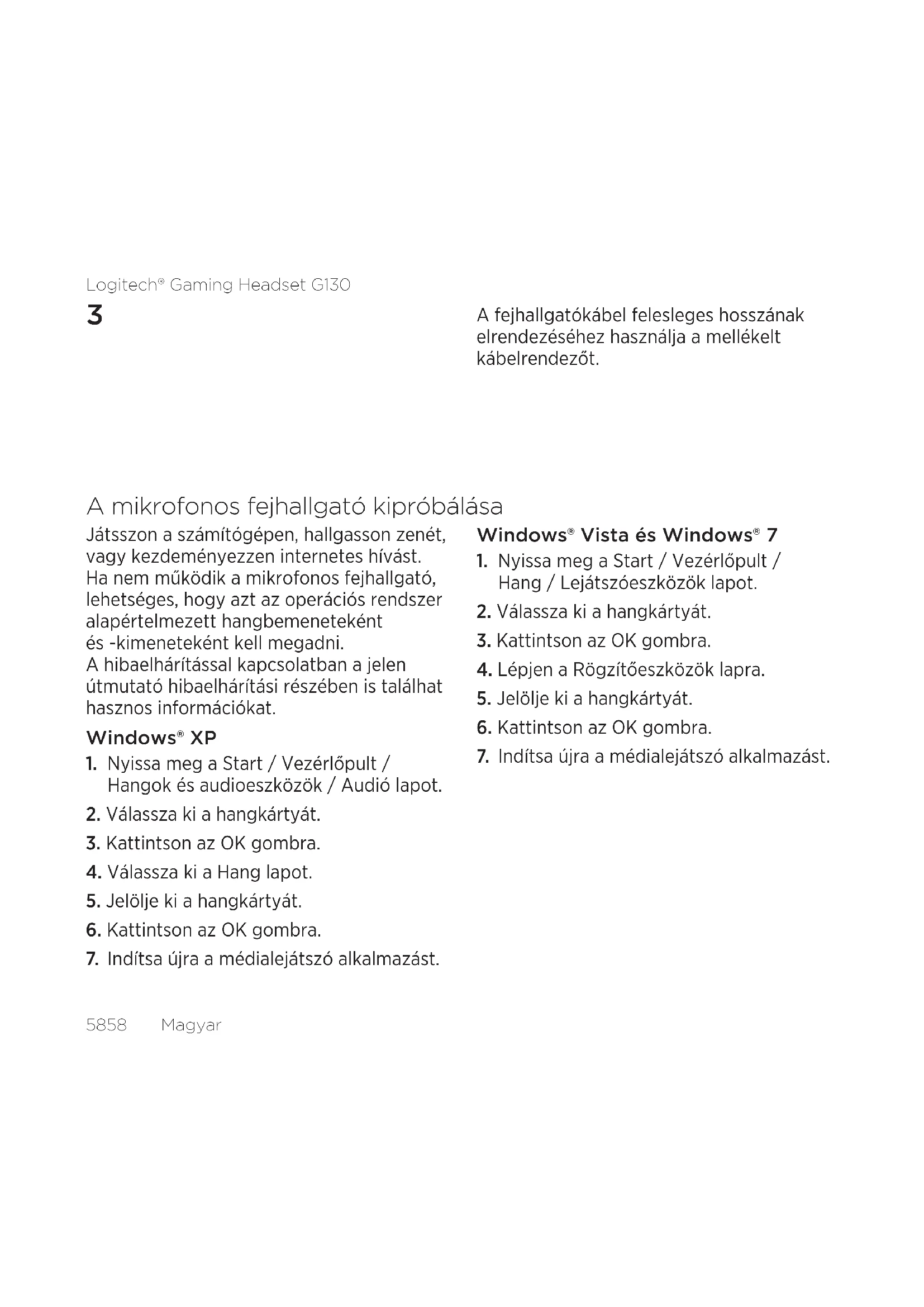 A fejhallgatókábel felesleges hosszának elrendezéséhez használja a mellékelt kábelrendezőt. A mikrofonos fejhallgató kipróbálása Játsszon a számítógépen, hallgasson zenét, vagy kezdeményezzen internetes hívást. Ha nem működik a mikrofonos fejhallgató, lehetséges, hogy azt az operációs rendszer alapértelmezett hangbemeneteként és -kimeneteként kell megadni. A hibaelhárítással kapcsolatban a jelen útmutató hibaelhárítási részében is találhat hasznos információkat. Windows® XP