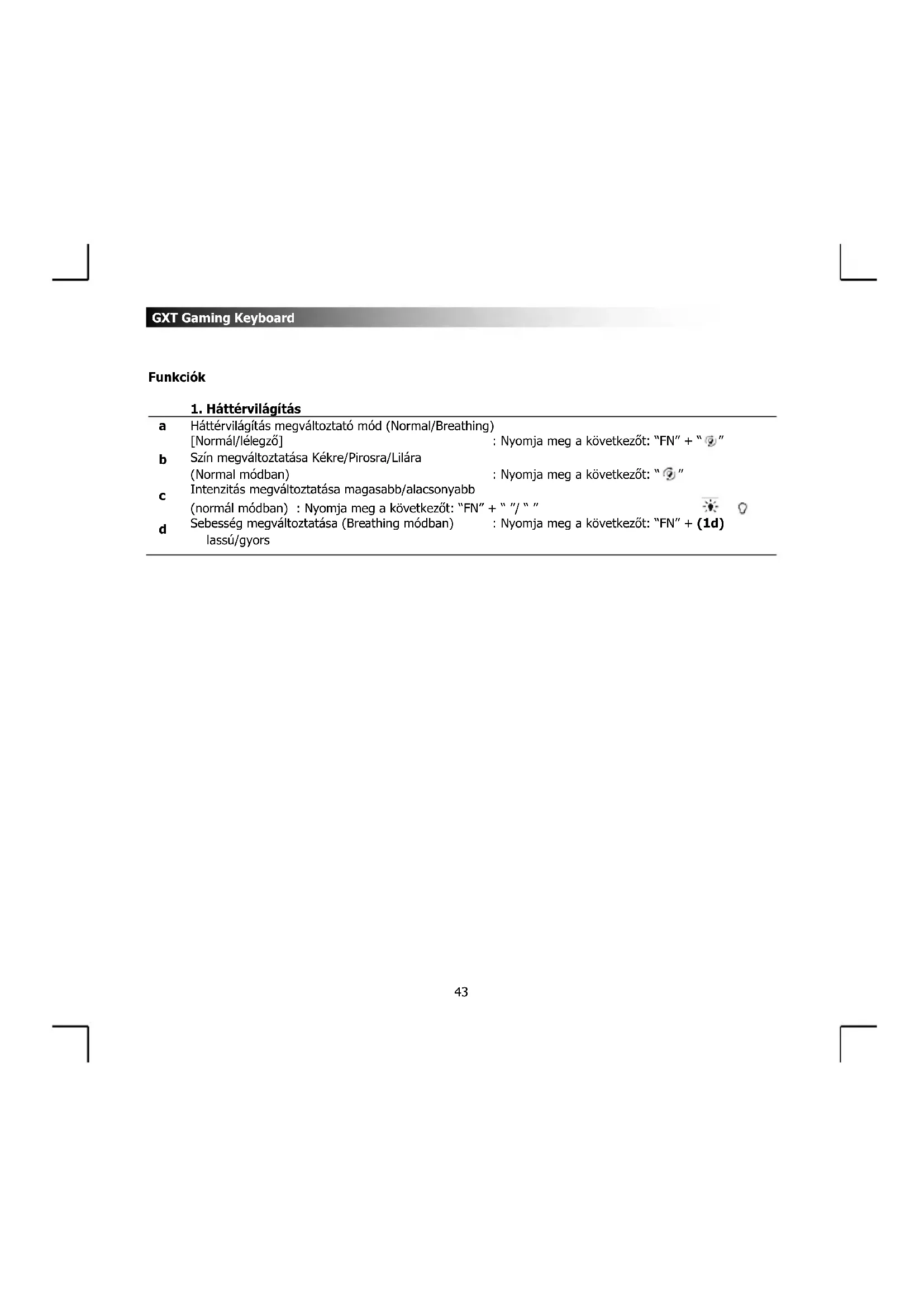 Háttérvilágítás megváltoztató mód (Normal/Breathing) [Normál/lélegző] : Nyomja meg a következőt: “FN” + “ ” Szín megváltoztatása Kékre/Pirosra/Lilára (Normal módban) : Nyomja meg a következőt: “ ” Intenzitás megváltoztatása magasabb/alacsonyabb (normál módban) : Nyomja meg a következőt: “FN” + “ ”/ “ ” Sebesség megváltoztatása (Breathing módban) : Nyomja meg a következőt: “FN” + (1d) lassú/gyorsGXT Gaming Keyboard