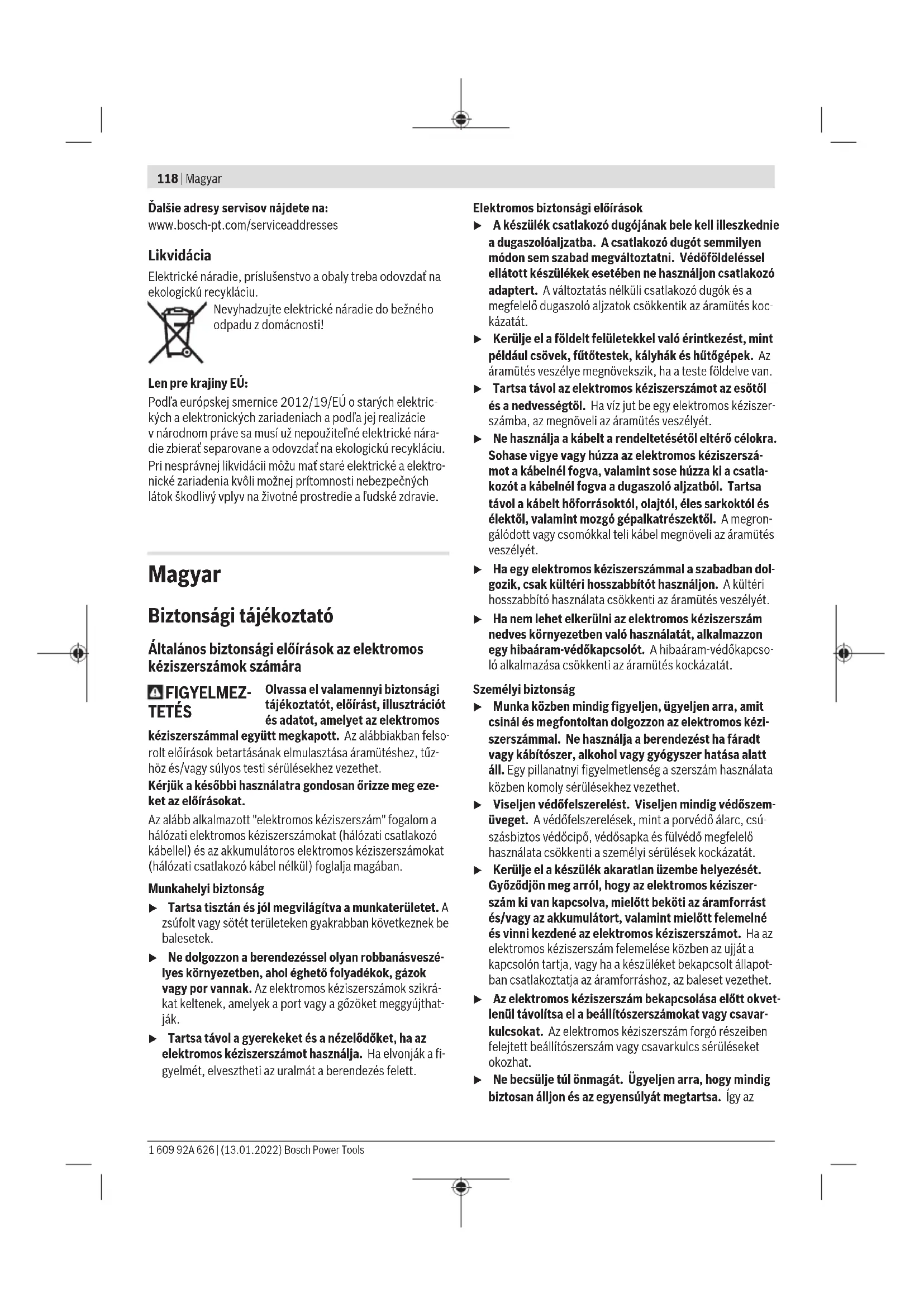 1,5 1,5 1,5 1,5 Az ezen utasításokban megadott rezgésszint és zajkibocsátá- si érték egy szabványban rögzített mérési módszerrel került meghatározásra és az elektromos kéziszerszámok egymással való összehasonlítására alkalmazható. Ez az érték a rezgés- és zajkibocsátás ideiglenes becslésére is alkalmas. A megadott rezgésszint és zajkibocsátási érték az elektro- mos kéziszerszám fő alkalmazásaira vonatkozik. Ha az elekt- romos kéziszerszámot más alkalmazásokra, eltérő betétszer- számokkal vagy nem kielégítő karbantartás mellett használ- ják, a rezgésszint és a zajkibocsátási érték a fenti értékektől eltérhet. Ez az egész munkaidőre vonatkozó rezgés- és zajki- bocsátást lényegesen megnövelheti. A rezgés- és zajkibocsátás pontos megbecsüléséhez figye- lembe kell venni azokat az időszakokat is, amikor a készülék kikapcsolt állapotban van, vagy amikor be van ugyan kap- csolva, de nem kerül ténylegesen használatra. Ez az egész munkaidőre vonatkozó rezgés- és zajkibocsátást lényegesen csökkentheti. Hozzon kiegészítő biztonsági intézkedéseket a kezelőnek a rezgések hatása elleni védelmére, például: Az elektromos ké- ziszerszám és a betétszerszámok karbantartása, a kezek me- legen tartása, a munkamenetek megszervezése. Bosch Power Tools 1 609 92A 626 | (13.01.2022)122 | Magyar Összeszerelés u Az elektromos kéziszerszámon végzendő bármely munka megkezdése előtt húzza ki a csatlakozó dugót a dugaszolóaljzatból. Pótfogantyú u Az elektromos kéziszerszámot csak az arra felszerelt (14)pótfogantyúval együtt szabad használni. u Ügyeljen arra, hogy a pótfogantyú mindig szorosan meg legyen húzva. Ellenkező esetben munka közben el- vesztheti az uralmát az elektromos kéziszerszám felett. A pótfogantyú elforgatása (lásd a Aábrát) A (14) pótfogantyút a biztonságos és fáradságmentes mun- kához bármilyen megfelelő helyzetbe lehet forgatni. – Forgassa el a (14)pótfogantyú alsó markolatát az óramu- tató járásával ellenkező irányba és forgassa el a (14)pótfogantyút a kívánt helyzetbe. Forgassa el ismét a (14)pótfogantyú alsó markolatát az óramutató járásával megegyező irányba és ezzel szorítsa meg azt. Ügyeljen arra, hogy a pótfogantyú feszítőszalag beillesz- kedjen a házon erre a célra előirányzott horonyba. A fúrótokmány és a szerszámok kijelölése Az ütvefúráshoz és a véséshez SDS-plus szerszámokra van szükség, amelyeket az SDS-plus fúrótokmányba kell behe- lyezni. Fában, fémekben, kerámikus anyagokban és műanyagban ütés nélküli fúrásra, valamint csavarozásra SDS-plus nélküli szerszámokat (például hengeres szárú fúrót) kell használni. Ezekhez a szerszámokhoz egy gyorsbefogó vagy egy fogas- koszorús fúrótokmányt kell használni. A fúrótokmány kicserélése A fogaskoszorús fúrótokmány behelyezése/kivétele