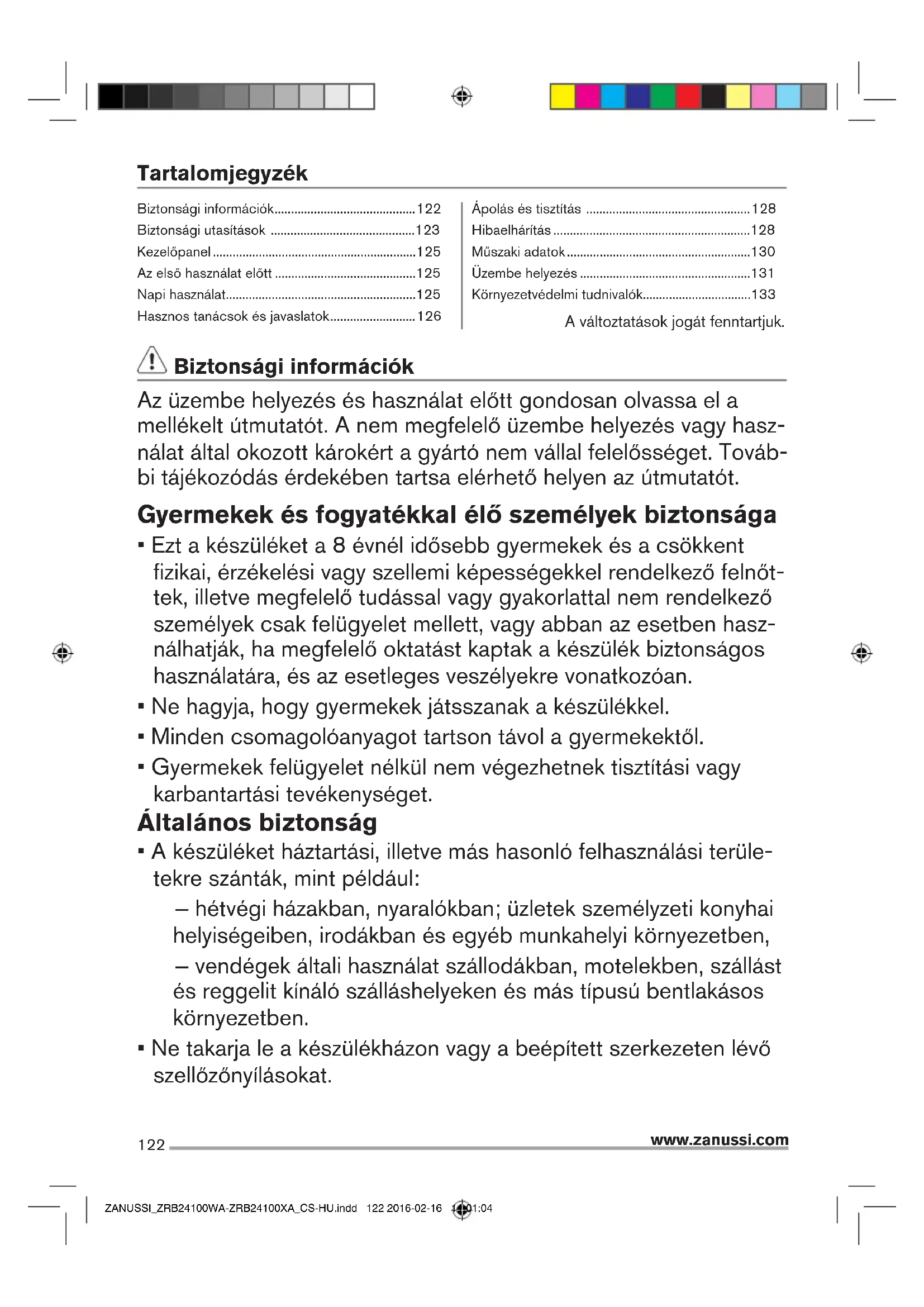, заедно с битовите отпадъци. Върнете уреда в местния пункт за ре- циклиране или се обърнете към вашата общинска служба. ZANUSSI_ZRB24100WA-ZRB24100XA_CS-HU.indd 121 2016-02-16 11:01:03122 www.zanussi.com Tartalomjegyzék A változtatások jogát fenntartjuk. Biztonsági információk Az üzembe helyezés és használat előtt gondosan olvassa el a mellékelt útmutatót. A nem megfelelő üzembe helyezés vagy hasz- nálat által okozott károkért a gyártó nem vállal felelősséget. Továb- bi tájékozódás érdekében tartsa elérhető helyen az útmutatót. Gyermekek és fogyatékkal élő személyek biztonsága