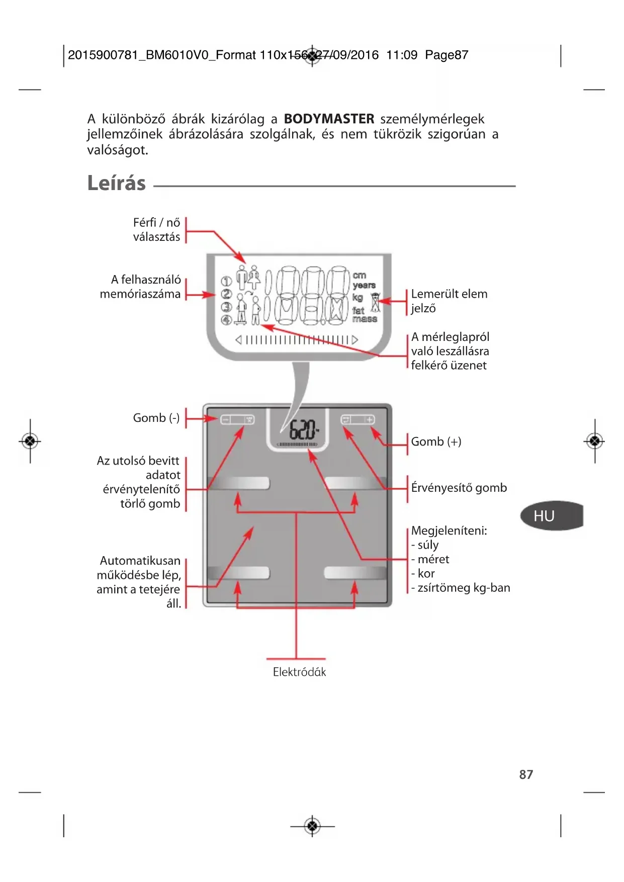 A különböző ábrák kizárólag a BODYMASTER személymérlegek jellemzőinek ábrázolására szolgálnak, és nem tükrözik szigorúan a valóságot. Leírás Férfi / nő választás A felhasználó memóriaszáma Gomb (-) Az utolsó bevitt adatot érvénytelenítő törlő gomb Automatikusan működésbe lép, amint a tetejére áll. Lemerült elem jelző A mérleglapról való leszállásra felkérő üzenet Gomb (+) Érvényesítő gomb Megjeleníteni: - súly - méret - kor - zsírtömeg kg-ban Elektródák 2015900781_BM6010V0_Format 110x156 27/09/2016 11:09 Page87A testsúly új megközelítése Testsúlyának és alakjának ellenőrzés alatt tartása érdekében fontos a test összetételének ismerete (víz, izom, csont és zsírtömeg). A testsúly jelentős részét képező izomzat és zsírtömeg az élet elengedhetetlen részei, amelyek kiegyensúlyozott eloszlásban kell jelen legyenek a szervezetben. Ez az eloszlás nemtől, kortól és magasságtól függően változik. Az izomzat lehetővé teszi fizikai tevékenységek elvégzését, tárgyak megemelését és a fáradtság nélküli mozgást. Minél nagyobb az izomtömeg, annál több energiát emészt fel, így segít a testsúly ellenőrzés alatt tartásában. A zsírtömeg szerepe a szigetelés, a védelem és az energiatárolás. A zsírtömeg passzív, és eltárolja a fölösleges kalóriákat, amelyek abban az esetben jelentkeznek, ha többet fogyaszt, mint amennyit felhasznál. Ez fizikai gyakorlatokkal csökkenthető, az ülő életmód azonban növeli. Nagy mennyiségben a zsírtömeg veszélyessé válik az életre (szív- és érrendszeri megbetegedések, koleszterin stb.). Fogyókúra esetén a BODYMASTER személymérleg segít Önnek a zsírtömegvesztés ellenőrzésében, az izomtömeg megtartása mellett. Egy nem megfelelően alkalmazott fogyókúra izomtömeg-csökkenést okozhat. Viszont az izmok azok, amelyek az energiafogyasztást biztosítják. Izomcsökkenés esetén a szervezet kevesebb energiát éget el, és a test több zsírt tárol el. Következésképpen a zsírtömeg nem csökkenthető tartósan az izomtömeg megőrzése nélkül. A BODYMASTER személymérleg lehetővé teszi fogyókúrájának irányítását és teste egyensúlyának tartós ellenőrzés alatt tartását. Annak érdekében, hogy a készüléket teljes megelégedéssel használja, a testsúly mérését mindig ugyanolyan körülmények között végezze: – kötelezően mezítláb (közvetlen kapcsolat a bőrrel). Lábfejei szárazak kell legyenek, megfelelően elhelyezve az elektródákon (lásd a 2. oldalt). Figyelem! Túl sok bőrkeményedés téves mérési eredményeket okozhat. – lehetőleg hetente egyszer, ébredéskor (a táplálkozással, emésztéssel és fizikai tevékenységgel kapcsolatos súlyingadozások kiszűrése érdekében). – negyed órával ébredés után, hogy a testben található víz eloszlódjon az alsó végtagokban. Fontos továbbá, hogy a lábak (combok, térdek, lábikra) és a lábfejek ne érintkezzenek egymással. Szükség esetén csúsztasson egy papírlapot a két lába közé.