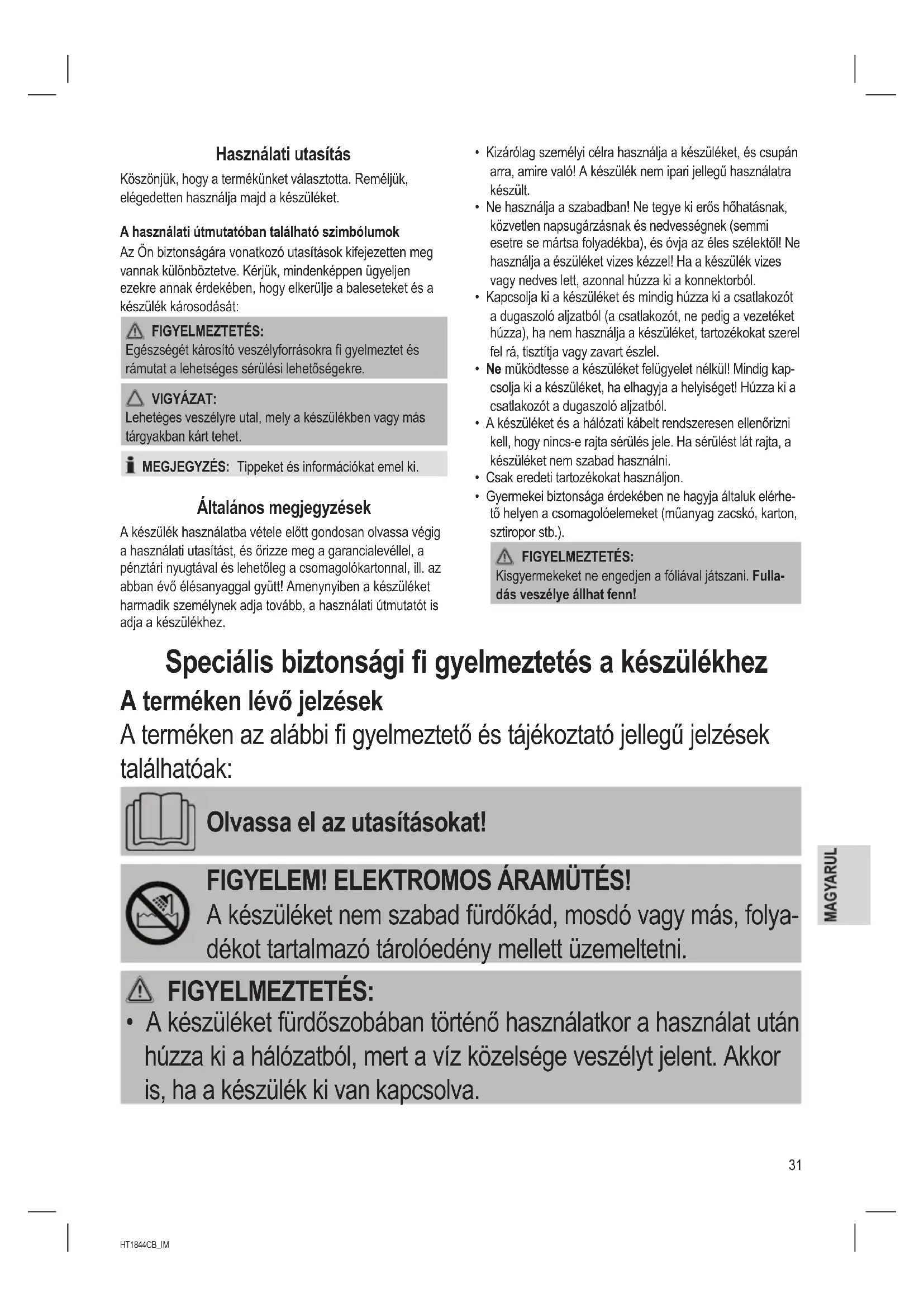 - A készüléket fürdőszobában történő használatkor a használat után húzza ki a hálózatból, mert a víz közelsége veszélyt jelent. Akkor is, ha a készülék ki van kapcsolva.32 HT1844CB_IM 28.01.16 FIGYELMEZTETÉS: