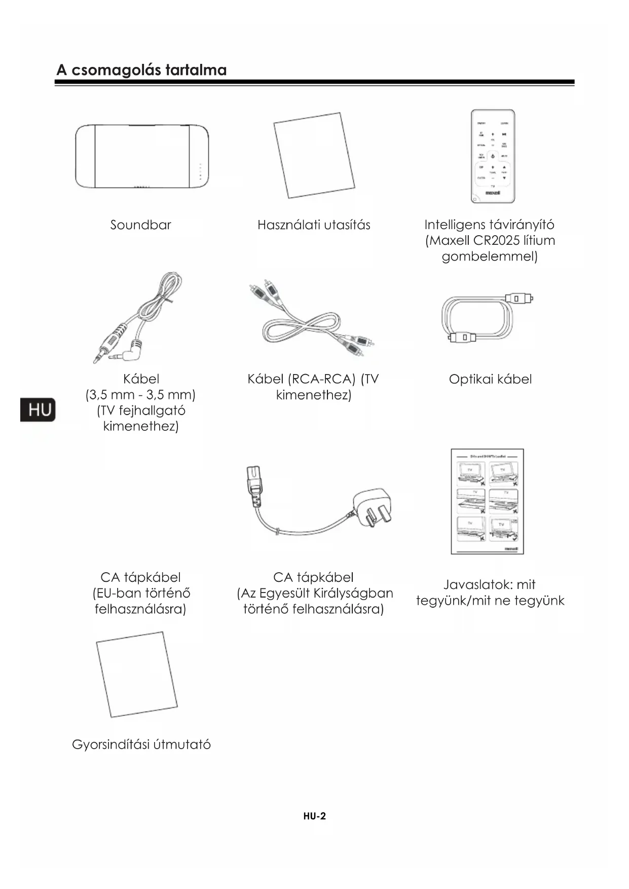 Amennyiben a soundbart tartósabb ideig nem használja, kapcsolja le és húzza ki a csatlakozódugót. Áramütés vagy fizikai sérülés elkerülése érdekében tartsa be ezeket a biztonsági előírásokat.A csomagolás tartalma HU-5 Biztonsági előírások 1 Olvassa el az utasításokat. 2 Tartsa be az utasításokat. 3 Vegye figyelembe az összes figyelmeztetést. 4 Kövesse az utasításokat. 5 A termék csak beltérben használható. 6 A terméket kizárólag száraz ronggyal tisztítsa. 7 Védje a kábelt, hogy ne lehessen rálépni. 8 Kizárólag a gyártó által javasolt rögíztőelemeket/tartozékokat használja. 9 Kizárólag a gyártó által javasolt vagy jóváhagyott kocsit, tartót, vagy asztalt használja. Ha kocsit használ, ügyeljen a mozgatásra, nehogy leesen a készülék. 10 NE VÉGEZZEN KARBANTARTÁST A KÉSZÜLÉKEN. Ha a készülék megsérült, bármilyen jellegű is a meghibásodás (elektromos kábel vagy tápcsatlakozó meghibásodása, folyadék szivárgás, a termékbe jutott idegen anyag, esőnek vagy nedvességnek való kitétel, rendellenes működés, a készülék leesése), ne végezzen rajta karbantartást. 11 A készülék egy II. kategóriájú szigeteletlen és földeletlen soundbar. 12 A CA tápcsatlakozó a fő megszakító eszköz. A csatlakozódugónak mindig könnyen hozzáférhető helyen kell lennie. 13 FIGYELMEZTETÉS: ha gyermekek a készülékhez csatlakoztatott tévékészüléket meglökik, húzzák, vagy felmásznak rá, a készülék leeshet és súlyos, halálos sérülést okozhat. A nagyobb biztonság és stabilitás érdekében a tévékészüléket lássa el felborulásgátló berendezéssel.Alkatrészek megnevezése HU-6 felülnézet