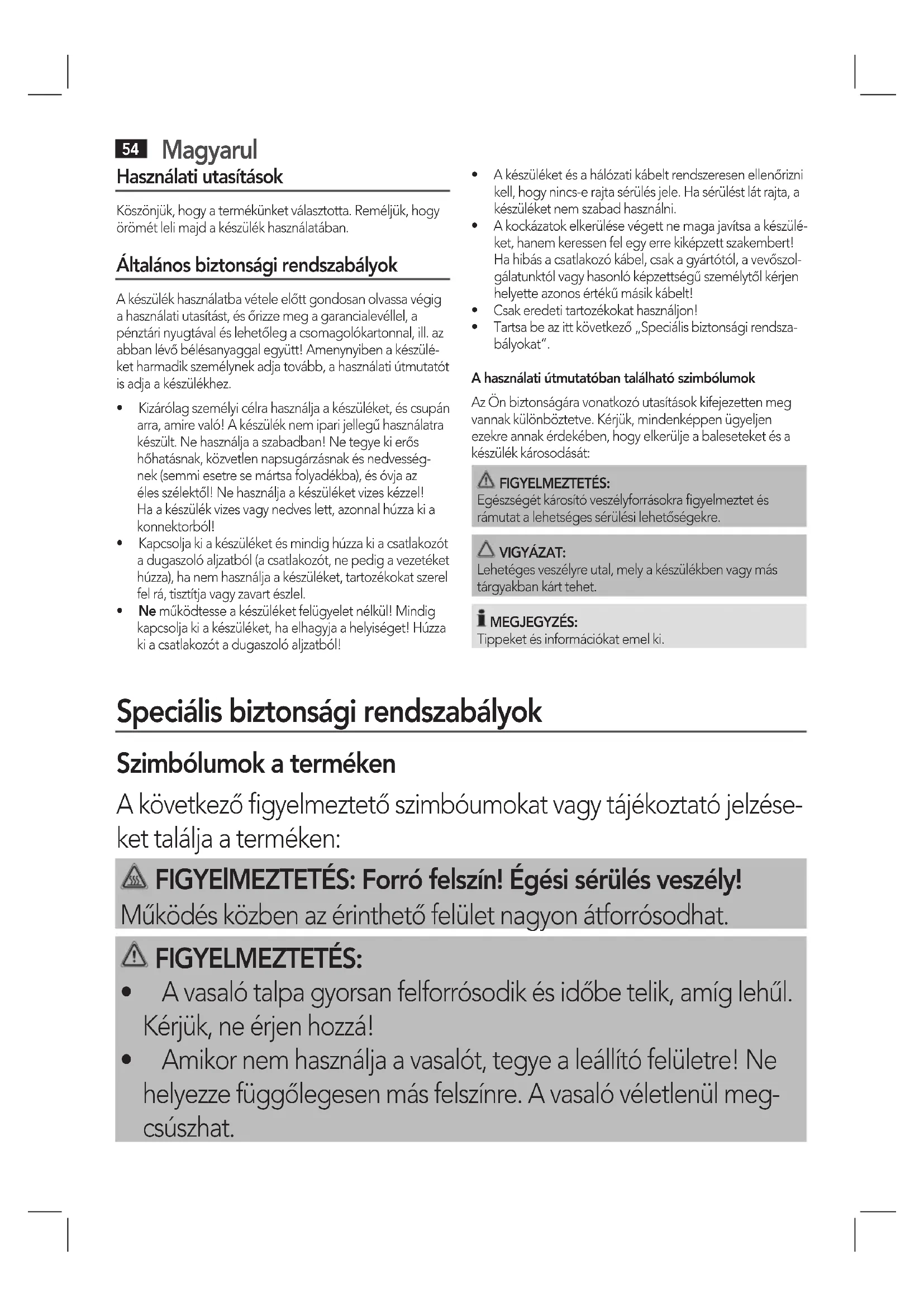 Használati utasítások Köszönjük, hogy a termékünket választotta. Reméljük, hogy örömét leli majd a készülék használatában. Általános biztonsági rendszabályok A készülék használatba vétele előtt gondosan olvassa végig a használati utasítást, és őrizze meg a garancialevéllel, a pénztári nyugtával és lehetőleg a csomagolókartonnal, ill. az abban lévő bélésanyaggal együtt! Amenynyiben a készülé-ket harmadik személynek adja tovább, a használati útmutatót is adja a készülékhez.• Kizárólagszemélyicélrahasználjaakészüléket,éscsupánarra, amire való! A készülék nem ipari jellegű használatra készült. Ne használja a szabadban! Ne tegye ki erős hőhatásnak, közvetlen napsugárzásnak és nedvesség-nek (semmi esetre se mártsa folyadékba), és óvja az éles szélektől! Ne használja a készüléket vizes kézzel! Ha a készülék vizes vagy nedves lett, azonnal húzza ki a konnektorból!• Kapcsoljakiakészüléketésmindighúzzakiacsatlakozóta dugaszoló aljzatból (a csatlakozót, ne pedig a vezetéket húzza), ha nem használja a készüléket, tartozékokat szerel fel rá, tisztítja vagy zavart észlel.• Ne működtesse a készüléket felügyelet nélkül! Mindig kapcsolja ki a készüléket, ha elhagyja a helyiséget! Húzza ki a csatlakozót a dugaszoló aljzatból!• Akészüléketésahálózatikábeltrendszeresenellenőriznikell, hogy nincs-e rajta sérülés jele. Ha sérülést lát rajta, a készüléket nem szabad használni.• Akockázatokelkerülésevégettnemagajavítsaakészülé-ket, hanem keressen fel egy erre kiképzett szakembert! Ha hibás a csatlakozó kábel, csak a gyártótól, a vevőszol-gálatunktól vagy hasonló képzettségű személytől kérjen helyette azonos értékű másik kábelt!• Csakeredetitartozékokathasználjon!• Tartsabeazittkövetkező„Speciálisbiztonságirendsza-bályokat“.A használati útmutatóban található szimbólumokAz Ön biztonságára vonatkozó utasítások kifejezetten meg vannak különböztetve. Kérjük, mindenképpen ügyeljen ezekre annak érdekében, hogy elkerülje a baleseteket és a készülék károsodását: FIGYELMEZTETÉS:Egészségét károsító veszélyforrásokra figyelmeztet és rámutat a lehetséges sérülési lehetőségekre. VIGYÁZAT: Lehetéges veszélyre utal, mely a készülékben vagy más tárgyakban kárt tehet. MEGJEGYZÉS:Tippeket és információkat emel ki. Speciális biztonsági rendszabályok Szimbólumok a terméken A következő figyelmeztető szimbóumokat vagy tájékoztató jelzése- ket találja a terméken: FIGYElMEZTETÉS: Forró felszín! Égési sérülés veszély! Működés közben az érinthető felület nagyon átforrósodhat. FIGYELMEZTETÉS: