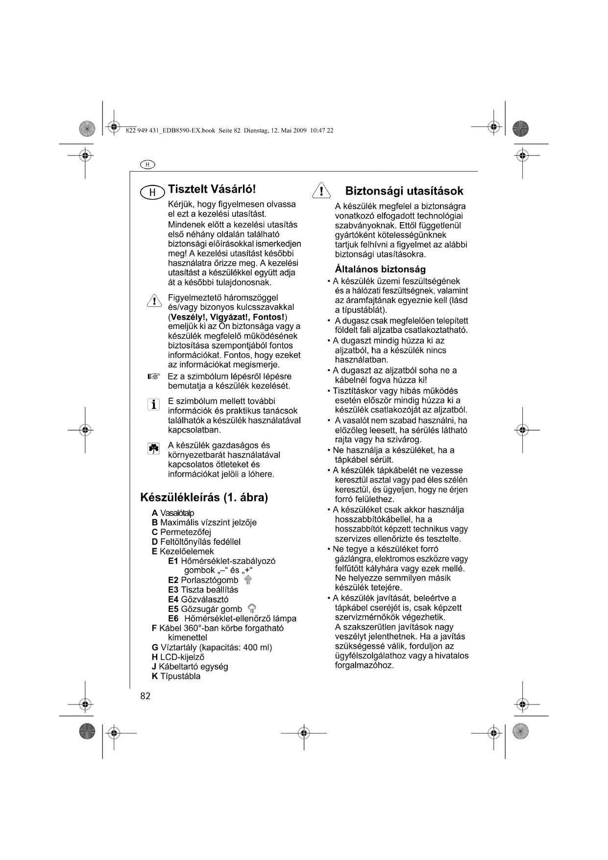 Tisztelt Vásárló! Kérjük, hogy figyelmesen olvassa el ezt a kezelési utasítást. Mindenek előtt a kezelési utasítás első néhány oldalán található biztonsági előírásokkal ismerkedjen meg! A kezelési utasítást későbbi használatra őrizze meg. A kezelési utasítást a készülékkel együtt adja át a későbbi tulajdonosnak. Figyelmeztető háromszöggel és/vagy bizonyos kulcsszavakkal (Veszély!, Vigyázat!, Fontos!) emeljük ki az Ön biztonsága vagy a készülék megfelelő működésének biztosítása szempontjából fontos információkat. Fontos, hogy ezeket az információkat megismerje. 0 Ez a szimbólum lépésről lépésre bemutatja a készülék kezelését. E szimbólum mellett további információk és praktikus tanácsok találhatók a készülék használatával kapcsolatban. A készülék gazdaságos és környezetbarát használatával kapcsolatos ötleteket és információkat jelöli a lóhere. Készülékleírás (1. ábra) A VasalótalpB Maximális vízszint jelzőjeC PermetezőfejD Feltöltőnyílás fedéllelE KezelőelemekE1 Hőmérséklet-szabályozó gombok „–“ és „+“E2 PorlasztógombE3 Tiszta beállításE4 GőzválasztóE5 Gőzsugár gomb E6 Hőmérséklet-ellenőrző lámpa F Kábel 360°-ban körbe forgatható kimenettelG Víztartály (kapacitás: 400 ml)H LCD-kijelzőJ Kábeltartó egységK Típustábla 1 Biztonsági utasítások A készülék megfelel a biztonságra vonatkozó elfogadott technológiai szabványoknak. Ettől függetlenül gyártóként kötelességünknek tartjuk felhívni a figyelmet az alábbi biztonsági utasításokra. Általános biztonság• A készülék üzemi feszültségének és a hálózati feszültségnek, valamint az áramfajtának egyeznie kell (lásd a típustáblát). A dugasz csak megfelelően telepített földelt fali aljzatba csatlakoztatható. • A dugaszt mindig húzza ki az aljzatból, ha a készülék nincs használatban.• A dugaszt az aljzatból soha ne a kábelnél fogva húzza ki! • Tisztításkor vagy hibás működés esetén először mindig húzza ki a készülék csatlakozóját az aljzatból. A vasalót nem szabad használni, ha előzőleg leesett, ha sérülés látható rajta vagy ha szivárog.• Ne használja a készüléket, ha a tápkábel sérült. • A készülék tápkábelét ne vezesse keresztül asztal vagy pad éles szélén keresztül, és ügyeljen, hogy ne érjen forró felülethez.• A készüléket csak akkor használja hosszabbítókábellel, ha a hosszabbítót képzett technikus vagy szervizes ellenőrizte és tesztelte.• Ne tegye a készüléket forró gázlángra, elektromos eszközre vagy felfűtött kályhára vagy ezek mellé. Ne helyezze semmilyen másik készülék tetejére.• A készülék javítását, beleértve a tápkábel cseréjét is, csak képzett szervizmérnökök végezhetik. A szakszerűtlen javítások nagy veszélyt jelenthetnek. Ha a javítás szükségessé válik, forduljon az ügyfélszolgálathoz vagy a hivatalos forgalmazóhoz.822 949 431_EDB8590-EX.book Seite 82 Dienstag, 12. Mai 2009 10:47 22h