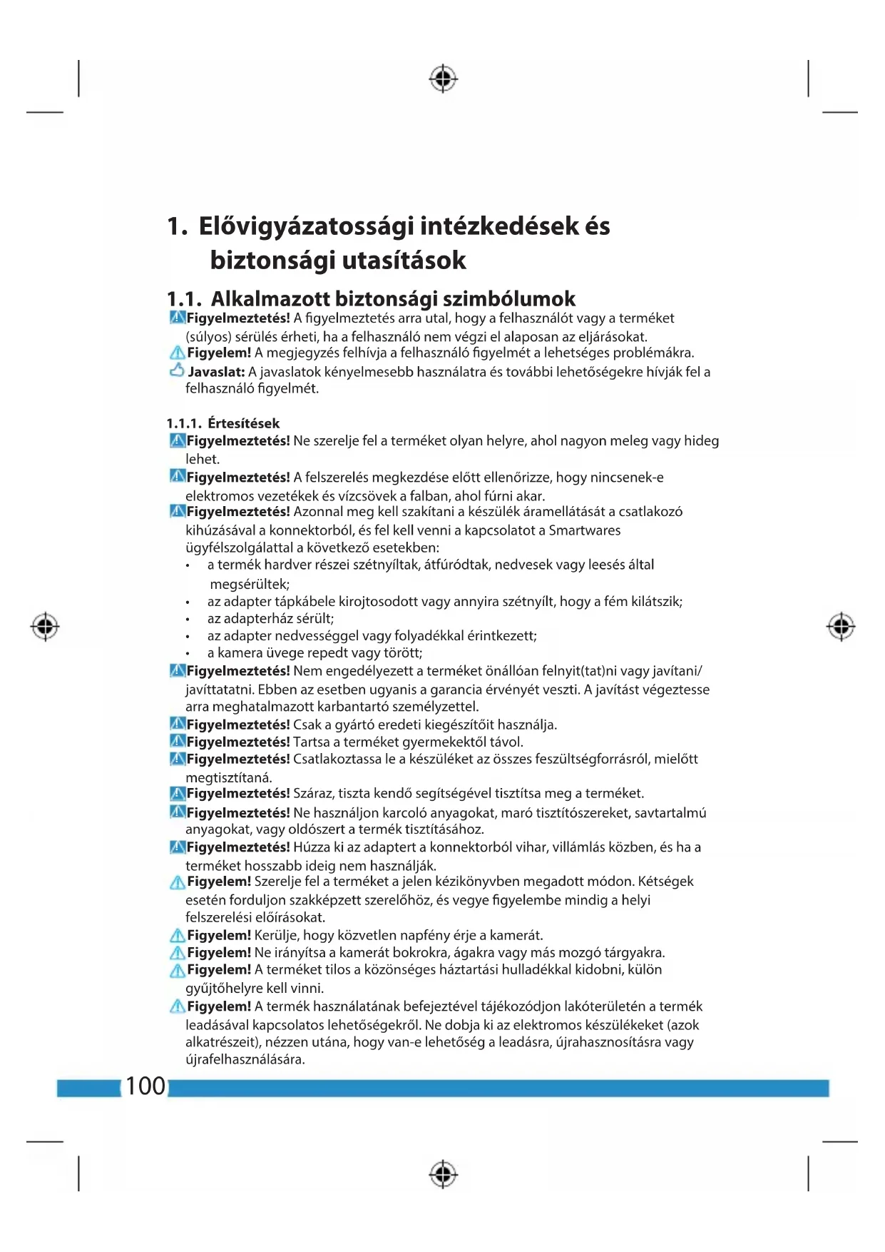 Figyelmeztetés! Húzza ki az adaptert a konnektorból vihar, villámlás közben, és ha a terméket hosszabb ideig nem használják. Figyelem! Szerelje fel a terméket a jelen kézikönyvben megadott módon. Kétségek esetén forduljon szakképzett szerelőhöz, és vegye gyelembe mindig a helyi felszerelési előírásokat. Figyelem! Kerülje, hogy közvetlen napfény érje a kamerát. Figyelem! Ne irányítsa a kamerát bokrokra, ágakra vagy más mozgó tárgyakra. Figyelem! A terméket tilos a közönséges háztartási hulladékkal kidobni, külön gyűjtőhelyre kell vinni. Figyelem! A termék használatának befejeztével tájékozódjon lakóterületén a termék leadásával kapcsolatos lehetőségekről. Ne dobja ki az elektromos készülékeket (azok alkatrészeit), nézzen utána, hogy van-e lehetőség a leadásra, újrahasznosításra vagy újrafelhasználására.101 Figyelem! A vezeték nélküli rendszereket zavarhatják a mobiltelefonok, a mikrohullámú sütők vagy más vezeték nélküli készülékek, melyek a 2,4 GHz-es tartományban működnek. Tartsa a terméket legalább 3 méterre a lehetséges zavarforrásoktól a telepítés és üzemeltetés során. Figyelem! A kamera éjszaka nem képes üvegen át látni. Vegye gyelembe ezt az elhelyezésekor.