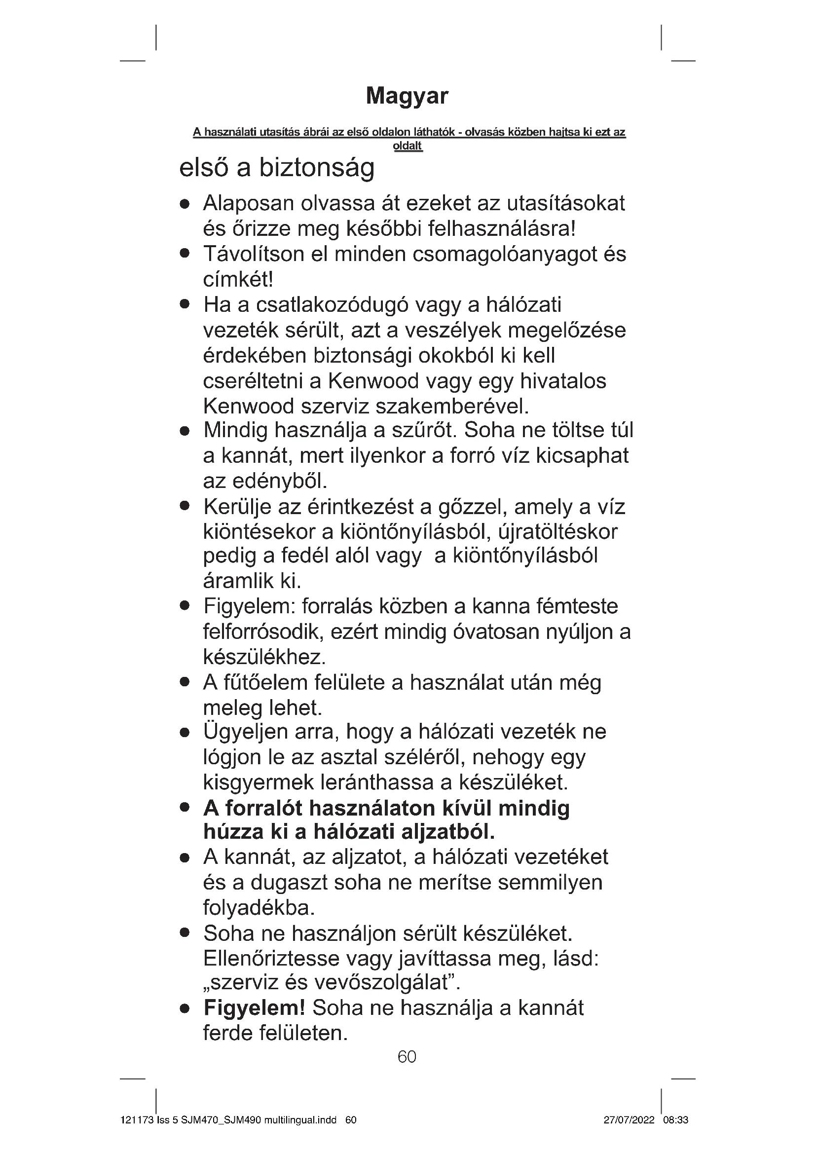 Figyelem! Soha ne használja a kannát ferde felületen. Magyar A használati utasítás ábrái az első oldalon láthatók - olvasás közben hajtsa ki ezt az oldalt 121173 Iss 5 SJM470_SJM490 multilingual.indd 60121173 Iss 5 SJM470_SJM490 multilingual.indd 60 27/07/2022 08:3327/07/2022 08:3361