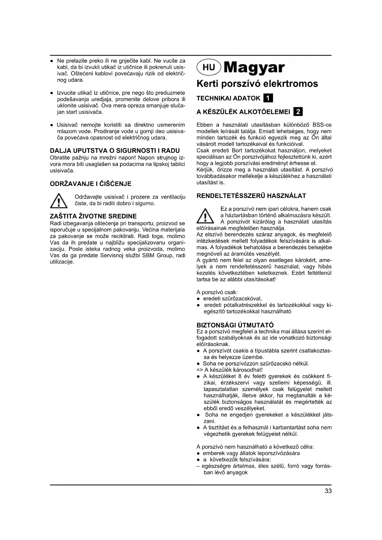 Radi izbegavanja oštećenja pri transportu, proizvod se isporučuje u specijalnom pakovanju. Većina materijala za pakovanje se može reciklirati. Radi toga, molimo Vas da ih predate u najbližu specijalizovanu organi- zaciju. Posle isteka radnog veka proizvoda, molimo Vas da ga predate Servisnoj službi SBM Group, radi utilizacije. Kerti porszívó elekrtromos TECHNIKAI ADATOK 1 A KÉSZÜLÉK ALKOTÓELEMEI 2 Ebben a használati utasításban különböző BSS-os modellek leírását találja. Emiatt lehetséges, hogy nem minden tartozék és funkció egyezik meg az Ön által vásárolt modell tartozékaival és funkcióival. Csak eredeti Bort tartozékokat használjon, melyeket speciálisan az Ön porszívójához fejlesztettünk ki, azért hogy a legjobb porszívási eredményt érhesse el. Kérjük, őrizze meg a használati utasítást. A porszívó továbbadásakor mellékelje a készülékhez a használati utasítást is.