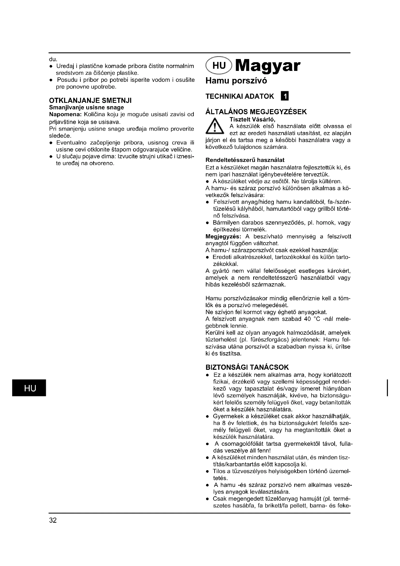 ● Ez a készülék nem alkalmas arra, hogy korlátozott fi zikai, érzékelő vagy szellemi képességgel rendel- kező vagy tapasztalat és/vagy ismeret hiányában lévő személyek használják, kivéve, ha biztonságu- kért felelős személy felügyeli őket, vagy betanították őket a készülék használatára. ● Gyermekek a készüléket csak akkor használhatják, ha 8 év felettiek, és ha biztonságukért felelős sze- mély felügyeli őket, vagy ha megtanították őket a készülék használatára. ● A csomagolófóliát tartsa gyermekektől távol, fulla- dás veszélye áll fenn! ● A készüléket minden használat után, és minden tisz- títás/karbantartás előtt kapcsolja ki. ● Tilos a tűzveszélyes helyiségekben történő üzemel- tetés. ● A hamu -és száraz porszívó nem alkalmas veszé- lyes anyagok leválasztására. ● Csak megengedett tüzelőanyag hamuját (pl. termé- szetes hasábfa, fa brikett/fa pellett, barna- és feke- du. ● Uređaj i plastične komade pribora čistite normalnim sredstvom za čišćenje plastike. ● Posudu i pribor po potrebi isperite vodom i osušite pre ponovne upotrebe. OTKLANJANJE SMETNJI Smanjivanje usisne snage Napomena: Količina koju je moguće usisati zavisi od prljavštine koja se usisava. Pri smanjenju usisne snage uređaja molimo proverite sledeće. ● Eventualno začepljenje pribora, usisnog creva ili usisne cevi otklonite štapom odgovarajuće veličine. ● U slučaju pojave dima: Izvucite strujni utikač i iznesi- te uređaj na otvoreno.