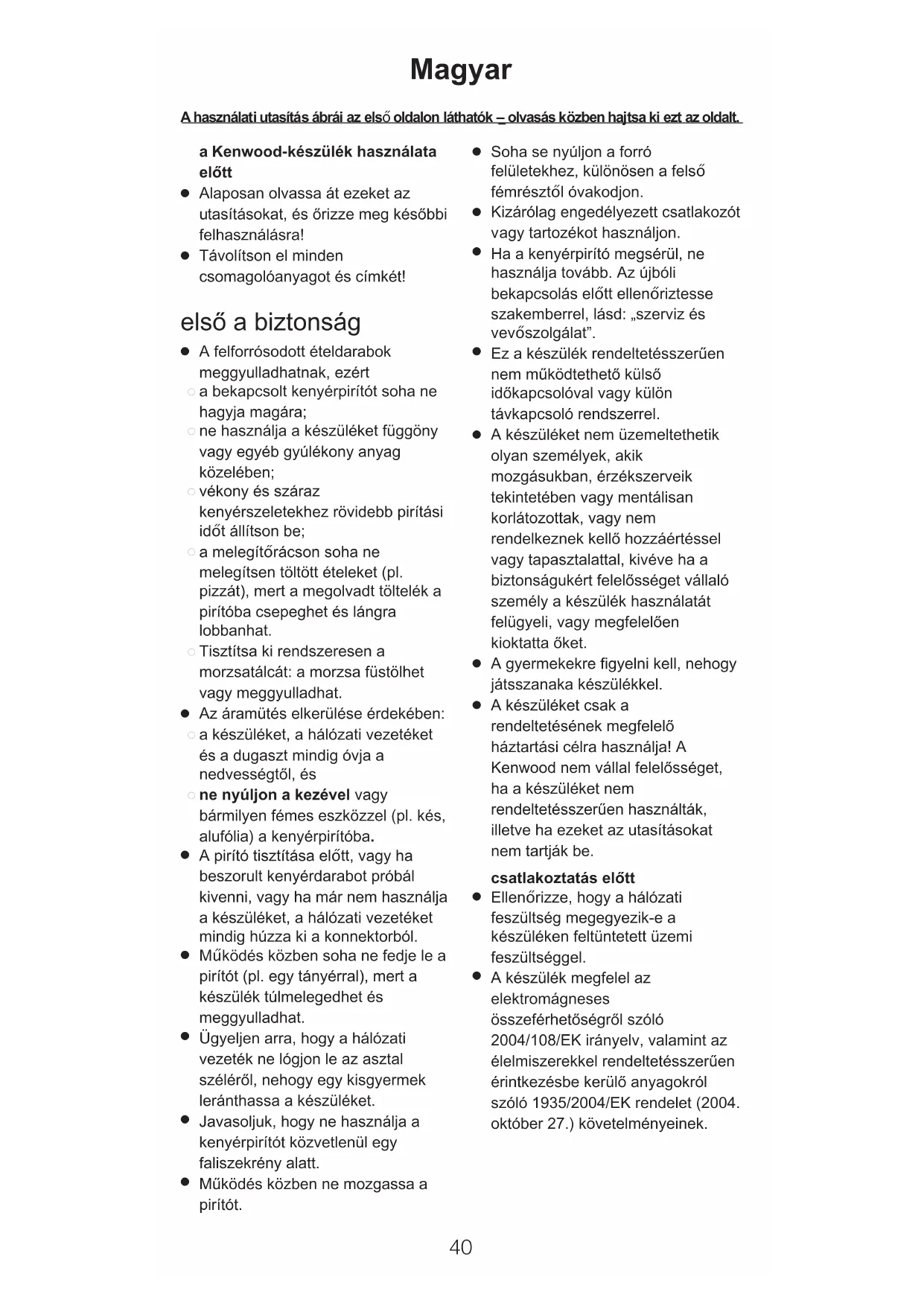 A készüléket csak a rendeltetésének megfelelő háztartási célra használja! A Kenwood nem vállal felelősséget, ha a készüléket nem rendeltetésszerűen használták, illetve ha ezeket az utasításokat nem tartják be. csatlakoztatás előtt