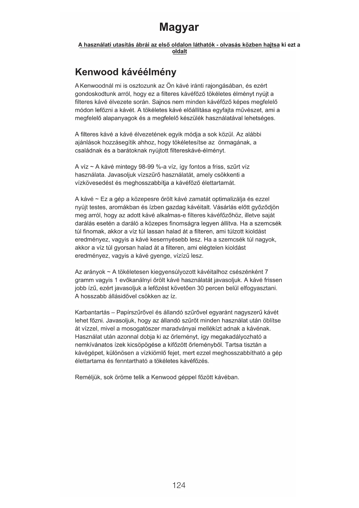 Kenwoodnál mi is osztozunk az Ön kávé iránti rajongásában, és ezért gondoskodtunk arról, hogy ez a filteres kávéfőző tökéletes élményt nyújt a filteres kávé élvezete során. Sajnos nem minden kávéfőző képes megfelelő módon lefőzni a kávét. A tökéletes kávé előállítása egyfajta művészet, ami a megfelelő alapanyagok és a megfelelő készülék használatával lehetséges. A filteres kávé a kávé élvezetének egyik módja a sok közül. Az alábbi ajánlások hozzásegítik ahhoz, hogy tökéletesítse az önmagának, a családnak és a barátoknak nyújtott filtereskávé-élményt. A víz ~ A kávé mintegy 98-99 %-a víz, így fontos a friss, szűrt víz használata. Javasoljuk vízszűrő használatát, amely csökkenti a vízkövesedést és meghosszabbítja a kávéfőző élettartamát. A kávé ~ Ez a gép a közepesre őrölt kávé zamatát optimalizálja és ezzel nyújt testes, aromákban és ízben gazdag kávéitalt. Vásárlás előtt győződjön meg arról, hogy az adott kávé alkalmas-e filteres kávéfőzőhöz, illetve saját darálás esetén a daráló a közepes finomságra legyen állítva. Ha a szemcsék túl finomak, akkor a víz túl lassan halad át a filteren, ami túlzott kioldást eredményez, vagyis a kávé kesernyésebb lesz. Ha a szemcsék túl nagyok, akkor a víz túl gyorsan halad át a filteren, ami elégtelen kioldást eredményez, vagyis a kávé gyenge, vízízű lesz. Az arányok ~ A tökéletesen kiegyensúlyozott kávéitalhoz csészénként 7 gramm vagyis 1 evőkanálnyi őrölt kávé használatát javasoljuk. A kávé frissen jobb ízű, ezért javasoljuk a lefőzést követően 30 percen belül elfogyasztani. A hosszabb állásidővel csökken az íz. Karbantartás – Papírszűrővel és állandó szűrővel egyaránt nagyszerű kávét lehet főzni. Javasoljuk, hogy az állandó szűrőt minden használat után öblítse át vízzel, mivel a mosogatószer maradványai mellékízt adnak a kávénak. Használat után azonnal dobja ki az őrleményt, így megakadályozható a nemkívánatos ízek kicsöpögése a kifőzött őrleményből. Tartsa tisztán a kávégépet, különösen a vízkiömlő fejet, mert ezzel meghosszabbítható a gép élettartama és fenntartható a tökéletes kávéfőzés. Reméljük, sok öröme telik a Kenwood géppel főzött kávéban. Magyar