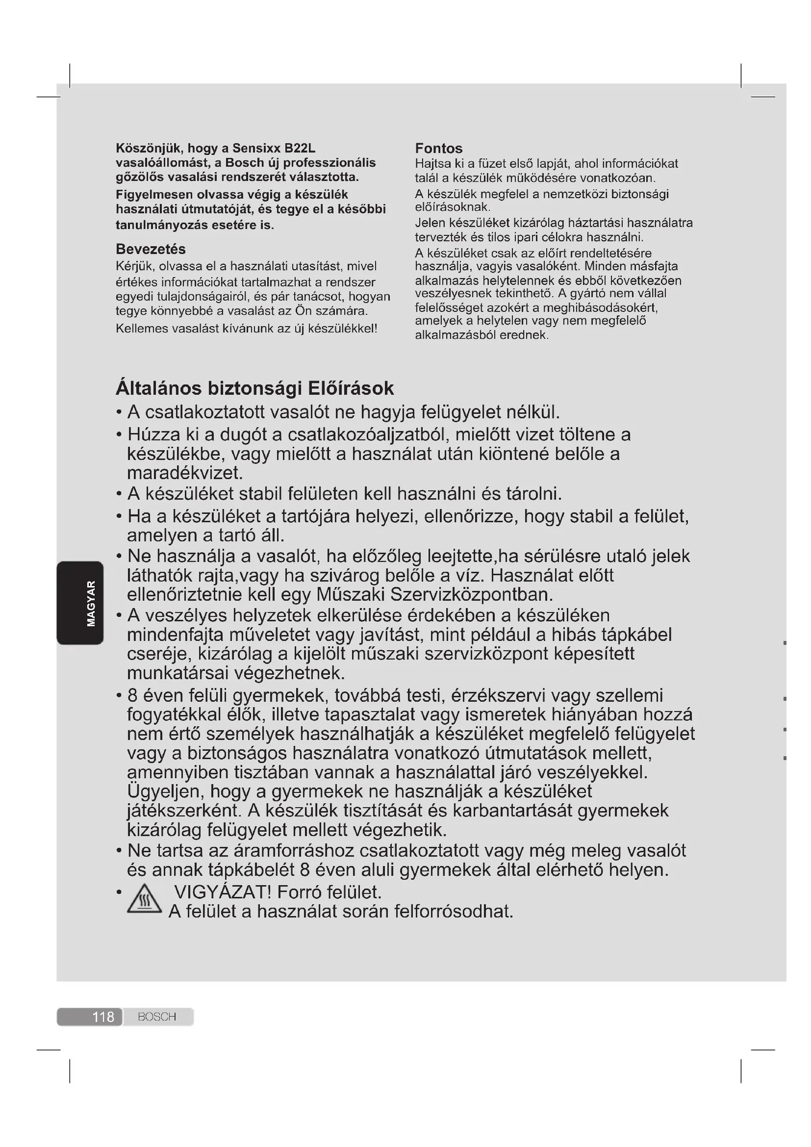A készülék magas hőmérsékleten működik és gőzt termel használat közben, ezért forrázást vagy égési sebeket okozhat, helytelen használat esetén. Használat közben a gőztömlő, a gőzállomás, az eltávolítható vasalótalp alján lévő fémlemez (2) és különösen a vasaló felforrósodhat. Ez normális jelenség. Soha ne irányítsa a gőzt emberek vagy állatok felé. Ne hagyja a kábelt érintkezni a vasaló talpával, amíg az forró. Vegye gyelembe, hogy a gőzvezérlő felengedését követően, egy rövid ideig további gőz távozhat. Ez normális jelenség.119 B O S C H Hajtsa ki a füzet első lapját, ahol információkat talál a készülék működésére vonatkozóan.A készülék megfelel a nemzetközi biztonsági előírásoknak.Jelen készüléket kizárólag háztartási használatra tervezték és tilos ipari célokra használni.A készüléket csak az előírt rendeltetésére használja, vagyis vasalóként. Minden másfajta alkalmazás helytelennek és ebből következően veszélyesnek tekinthető. A gyártó nem vállal felelősséget azokért a meghibásodásokért, amelyek a helytelen vagy nem megfelelő alkalmazásból erednek.