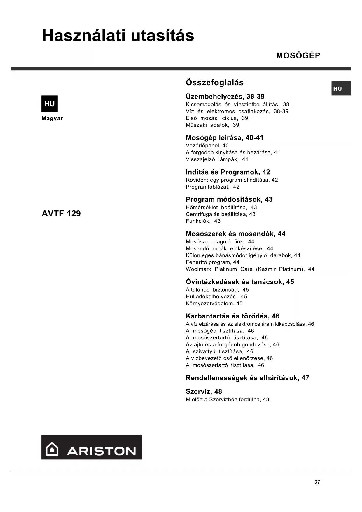 Óvintézkedések és tanácsok SzervizRendellenességekÓvintézkedések KarbantartásProgramok Mosószerek ÜzembehelyezésLeírás A mosógépet a nemzetközi biztonsági szabványoknak megfelelõen tervezték és gyártották. Ezeket a figyelmeztetéseket biztonsági okokból írjuk le, és figyelmesen el kell olvasni õket. Általános biztonság A mosógépet csak felnõtt használhatja, és csak az e használati utasításban megadott utasítások szerint. Ne érjen a géphez mezítláb, illetve vizes vagy nedves kézzel vagy lábbal. A csatlakozódugót az aljzatból ne a kábelt, hanem a csatlakozót fogva húzza ki. Ne nyissa ki a mosószeradagoló fiókot, ha a mosógép mûködik. Ne nyúljon a leeresztett vízbe, mert forró lehet. Semmiképpen ne feszegesse az ajtót: megsérülhet a véletlen nyitást akadályozó biztonsági retesz. Hiba esetén semmiképpen se nyúljon a gép belsõ részeihez, és ne próbálja megjavítani. Mindig ügyeljen arra, hogy gyerekek ne mehessenek a mûködõ gép közelébe. A mosás során az ajtó meleg lehet. Amennyiben a gépet át kell helyezni, két vagy három személy végezze, maximális figyelemmel. Soha sem egyedül, mert a gép nagyon súlyos. A mosandó berakása elõtt ellenõrizze, hogy a forgódob üres legyen. Hulladékelhelyezés A régi elektronikus termékek megsemmisítése Az elektromos készülékek megsemmisítésérol szóló európai direktíva 2002/96/EC eloírja, hogy a régi háztartási gépeket nem szabad a normál nem szelektív hulladékgyujtési folyamat során összegyujteni. A régi gépeket szelektíven kell összegyujteni, hogy optimalizálni lehessen a bennük lévo anyagok újrahasznosítását és csökkenteni lehessen az emberi egészségre és környezetre gyakorolt hatásukat. Az áthúzott szemeteskuka jele emlékezteti Önt arra, hogy kötelessége ezeket a termékeket szelektíven összegyujteni. A fogyasztóknak a helyi hatóságot vagy kereskedõt kell felkeresniük a régi háztartási gépek helyes elhelyezését illetõen. Öreg mosógép kidobása: mielõtt a hulladékok közé helyezné, tegye használhatatlanná úgy, hogy elvágja a hálózati kábelt, és letépi az ajtót. Környezetvédelem Környezetvédelmet szolgáló technológia Ha az ajtó üvegén keresztül kevés víz látszik, az azért van, mert az új technológiának köszönhetõen az Aristonnak a felénél kevesebb víz is elég ahhoz, hogy maximális tisztítóhatást érjen el: egy olyan cél, amelyet a környezet megóvása érdekében tûztünk ki. Takarítson meg mosószert, vizet, energiát és idõt Annak érdekében, hogy ne pazaroljunk az erõforrásokkal, a mosógépet teljes ruhatöltettel kell használni. Egy teljes ruhatöltettel való mosás két féltöltet helyett, akár 50% energia megtakarítást is lehetõvé tehet. Az elõmosás csak nagyon szennyezett ruhák esetén szükséges. Ha nem használja, azzal mosószert, idõt és 5-15% energiát takarít meg. Ha a foltokat a mosás elõtt folttisztítóval kezeli, és beáztatja, kevesebb szükség lesz a magas hõmérsékletû mosásra. A 60°C-on történõ mosás a 90°C helyett, vagy 40°C-on 60°C helyett akár 50% energiamegtakarításhoz is vezethet. Ha a mosószert a víz keménysége, a szennyezettség mértéke és a ruha mennyisége alapján helyesen adagolja, elkerüli a pazarlást és nem terheli feleslegesen a környezetet: még, ha biológiailag lebomló fajtájúak is, a mosószerek olyan összetevõket tartalmaznak, amelyek megváltoztatják a természet egyensúlyát. Ezen kívül, kerülje az öblítõszerek használatát, amennyire csak lehet. Ha a késõ délután és a kora hajnal közötti idõszakban mos, akkor hozzájárul ahhoz, hogy csökkentse az áramszolgáltató vállalatok terhelését. Ha a mosott ruhákat utána szárítógépben szárítja, magas fordulatszámú centrifugálást válasszon. Ha a mosott ruhában kevés a víz, idõt és energiát takarít meg a szárítóprogramnál.46