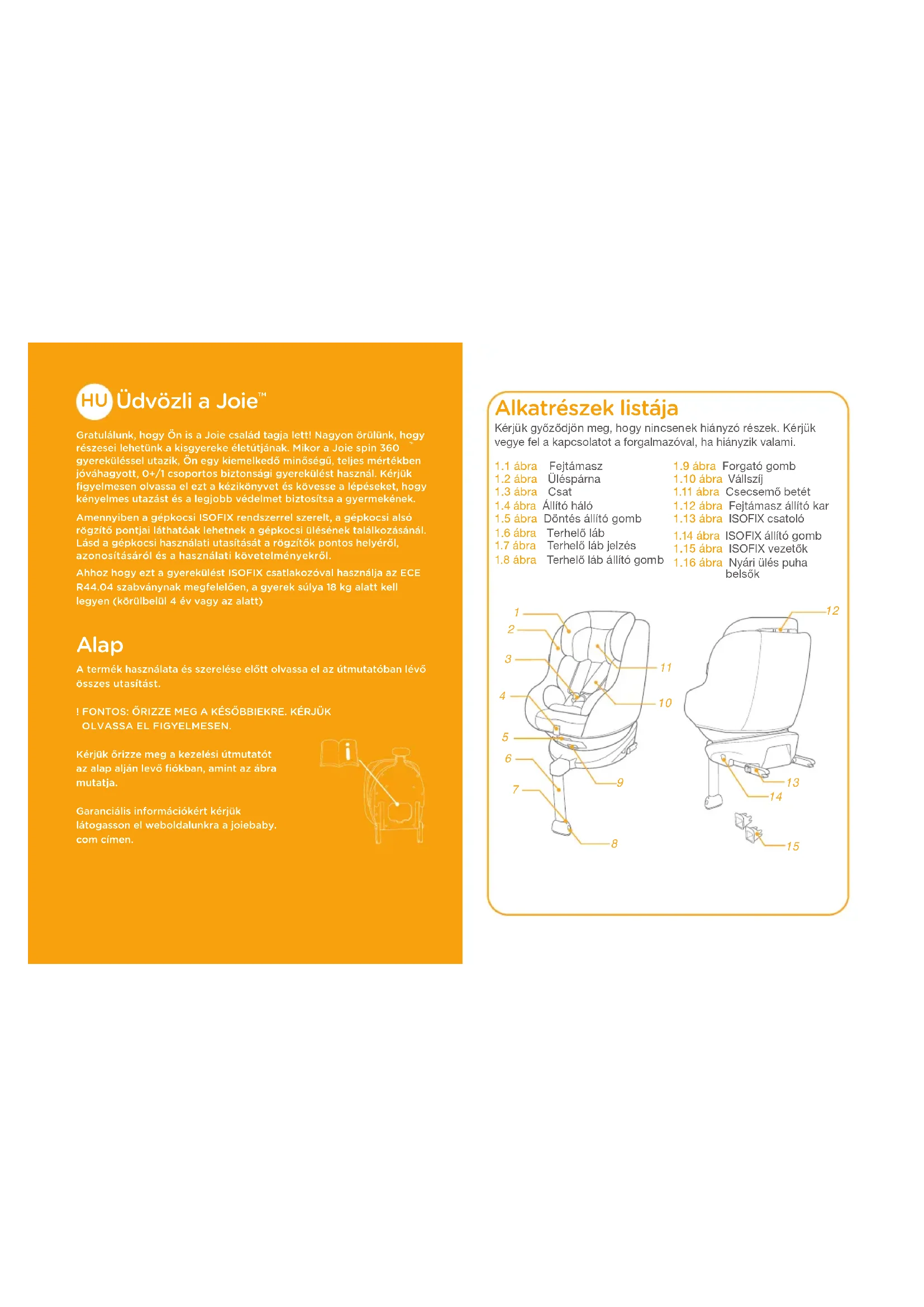 gyereküléssel utazik, Ön egy kiemelkedő minőségű, teljes mértékben jóváhagyott, 0+/1 csoportos biztonsági gyerekülést használ. Kérjük figyelmesen olvassa el ezt a kézikönyvet és kövesse a lépéseket, hogy kényelmes utazást és a legjobb védelmet biztosítsa a gyermekének.Amennyiben a gépkocsi ISOFIX rendszerrel szerelt, a gépkocsi alsó rögzítő pontjai láthatóak lehetnek a gépkocsi ülésének találkozásánál. Lásd a gépkocsi használati utasítását a rögzítők pontos helyéről, azonosításáról és a használati követelményekről.Ahhoz hogy ezt a gyerekülést ISOFIX csatlakozóval használja az ECE R44.04 szabványnak megfelelően, a gyerek súlya 18 kg alatt kell legyen (körülbelül 4 év vagy az alatt) Alap A termék használata és szerelése előtt olvassa el az útmutatóban lévő összes utasítást.! FONTOS: ŐRIZZE MEG A KÉSŐBBIEKRE. KÉRJÜK OLVASSA EL FIGYELMESEN.Kérjük őrizze meg a kezelési útmutatót az alap alján levő fiókban, amint az ábra mutatja.Garanciális információkért kérjük látogasson el weboldalunkra a joiebaby.com címen. Alkatrészek listája