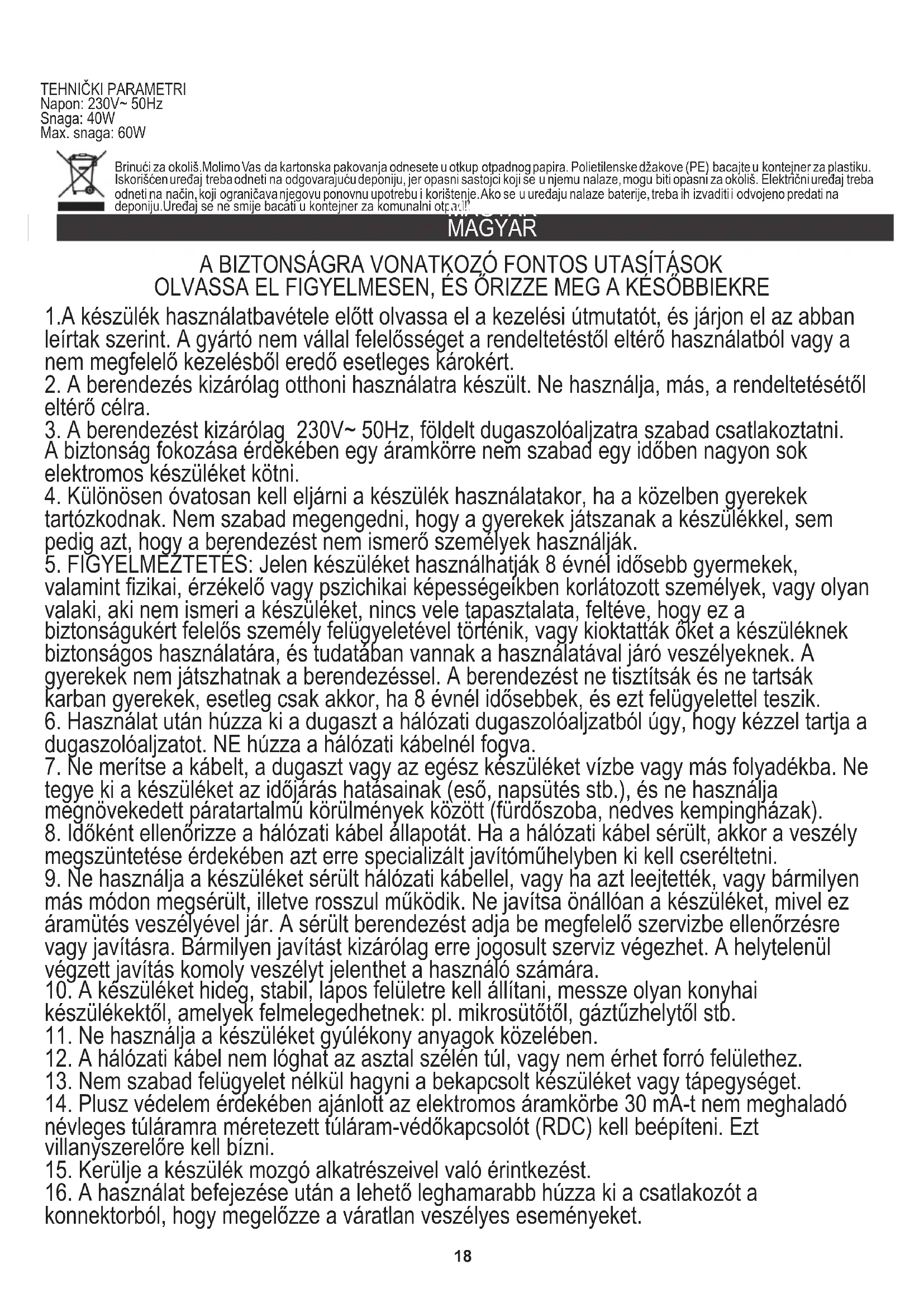 eltérő célra. 1.A készülék használatbavétele előtt olvassa el a kezelési útmutatót, és járjon el az abban leírtak szerint. A gyártó nem vállal felelősséget a rendeltetéstől eltérő használatból vagy a nem megfelelő kezelésből eredő esetleges károkért. OLVASSA EL FIGYELMESEN, ÉS ŐRIZZE MEG A KÉSŐBBIEKRE A BIZTONSÁGRA VONATKOZÓ FONTOS UTASÍTÁSOK Max. snaga: 60W Snaga: 40W Napon: 230V~ 50Hz
