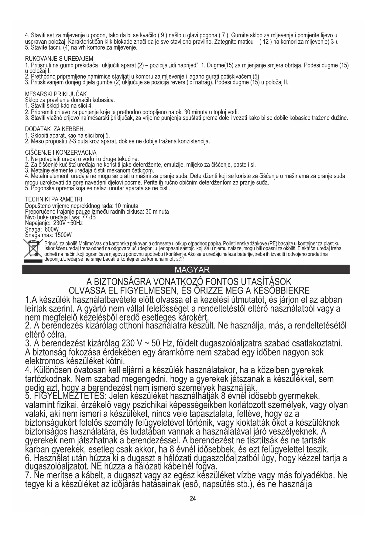Megengedett folyamatos működtetés:10 perc Szünet újrahasználat előtt:30 perc Készülék zajszintje LWA:77 dB Tápfeszültség: 230V ~50Hz Teljesítmény: 600W Maximális Teljesítmény: 1500W A környezet védelme érdekében kérjük külön karton dobozok és műanyag zsákokat és dobja őket a megfelelő hulladék közé. Használt készüléket kell eljuttatni a kijelölt gyűjtőhelyekre miatt veszélyes elemek alkatrészeket, amelyek hatással lehetnek a környezetre. Ne dobja a készüléket a közös szemétkosárba. македонски7.Никогаш не ставајте го кабелот, приклучникот или целиот уред во вода. Никогаш не изложувајте го уредот на атмосферски услови, како директна сончева светлина или дожд, итн. Никогаш не употребувајте го уредот во влажни услови.