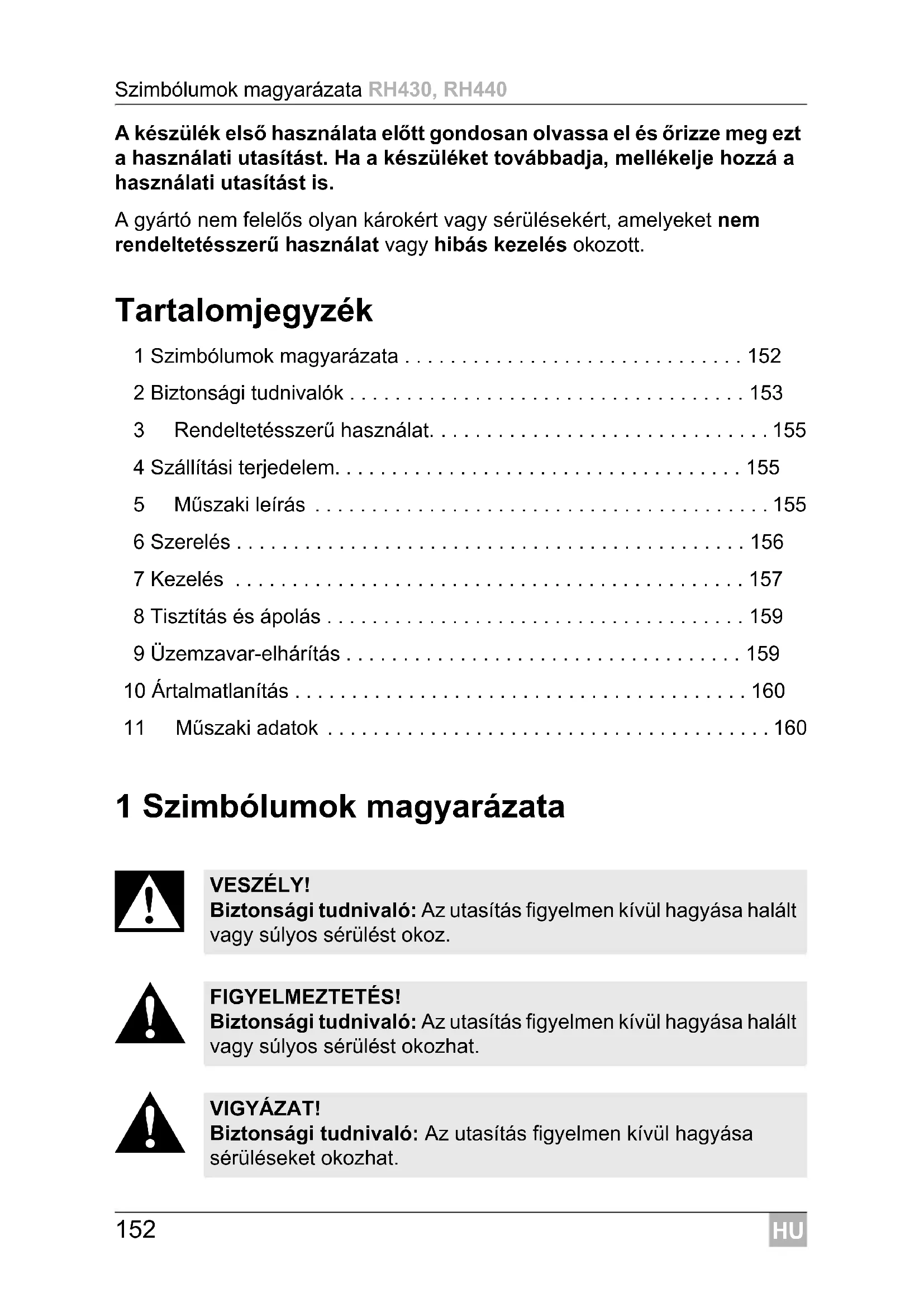 VESZÉLY! Biztonsági tudnivaló: Az utasítás figyelmen kívül hagyása halált vagy súlyos sérülést okoz. FIGYELMEZTETÉS! Biztonsági tudnivaló: Az utasítás figyelmen kívül hagyása halált vagy súlyos sérülést okozhat. VIGYÁZAT! Biztonsági tudnivaló: Az utasítás figyelmen kívül hagyása sérüléseket okozhat.HU RH430, RH440 Biztonsági tudnivalók