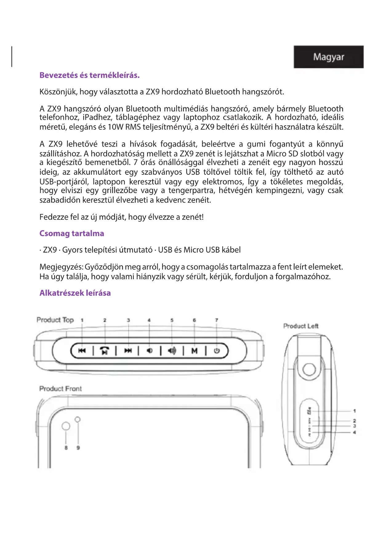 i redovito napunite. Tehnička podrška Posjetite našu web stranicu www.billowtechnology.com za više informacija o instalaciji i konguraciji ovog proizvoda.Bevezetés és termékleírás. Köszönjük, hogy választotta a ZX9 hordozható Bluetooth hangszórót. A ZX9 hangszóró olyan Bluetooth multimédiás hangszóró, amely bármely Bluetooth telefonhoz, iPadhez, táblagéphez vagy laptophoz csatlakozik. A hordozható, ideális méretű, elegáns és 10W RMS teljesítményű, a ZX9 beltéri és kültéri használatra készült. A ZX9 lehetővé teszi a hívások fogadását, beleértve a gumi fogantyút a könnyű szállításhoz. A hordozhatóság mellett a ZX9 zenét is lejátszhat a Micro SD slotból vagy a kiegészítő bemenetből. 7 órás önállósággal élvezheti a zenéit egy nagyon hosszú ideig, az akkumulátort egy szabványos USB töltővel töltik fel, így tölthető az autó USB-portjáról, laptopon keresztül vagy egy elektromos, Így a tökéletes megoldás, hogy elviszi egy grillezőbe vagy a tengerpartra, hétvégén kempingezni, vagy csak szabadidőn keresztül élvezheti a kedvenc zenéit. Fedezze fel az új módját, hogy élvezze a zenét! Csomag tartalma