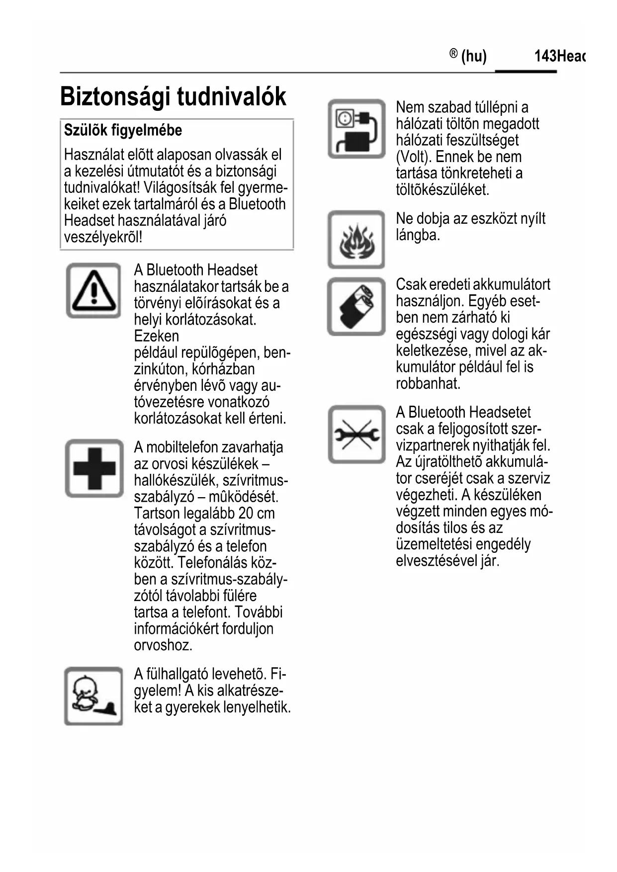 th® Biztonsági tudnivalók Szülõk figyelmébe Használat elõtt alaposan olvassák el a kezelési útmutatót és a biztonsági tudnivalókat! Világosítsák fel gyerme- keiket ezek tartalmáról és a Bluetooth Headset használatával járó veszélyekrõl! A Bluetooth Headset használatakor tartsák be a törvényi elõírásokat és a helyi korlátozásokat. Ezeken például repülõgépen, ben- zinkúton, kórházban érvényben lévõ vagy au- tóvezetésre vonatkozó korlátozásokat kell érteni. A mobiltelefon zavarhatja az orvosi készülékek – hallókészülék, szívritmus- szabályzó – mûködését. Tartson legalább 20 cm távolságot a szívritmus- szabályzó és a telefon között. Telefonálás köz- ben a szívritmus-szabály- zótól távolabbi fülére tartsa a telefont. További információkért forduljon orvoshoz. A fülhallgató levehetõ. Fi- gyelem! A kis alkatrésze- ket a gyerekek lenyelhetik. Nem szabad túllépni a hálózati töltõn megadott hálózati feszültséget (Volt). Ennek be nem tartása tönkreteheti a töltõkészüléket. Ne dobja az eszközt nyílt lángba. Csak eredeti akkumulátort használjon. Egyéb eset- ben nem zárható ki egészségi vagy dologi kár keletkezése, mivel az ak- kumulátor például fel is robbanhat. A Bluetooth Headsetet csak a feljogosított szer- vizpartnerek nyithatják fel. Az újratölthetõ akkumulá- tor cseréjét csak a szerviz végezheti. A készüléken végzett minden egyes mó- dosítás tilos és az üzemeltetési engedély elvesztésével jár.Headset PTT Bluetooth