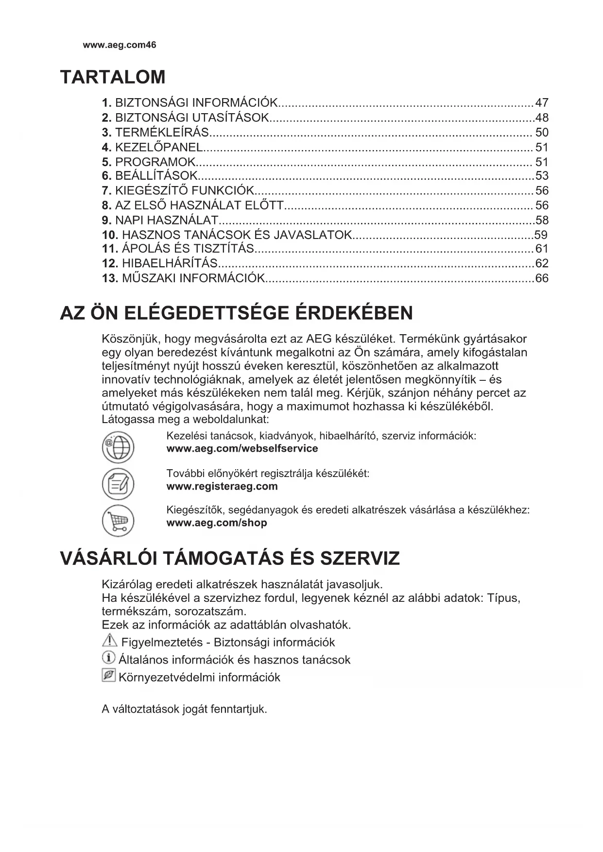 AZ ÖN ELÉGEDETTSÉGE ÉRDEKÉBEN Köszönjük, hogy megvásárolta ezt az AEG készüléket. Termékünk gyártásakor egy olyan beredezést kívántunk megalkotni az Ön számára, amely kifogástalan teljesítményt nyújt hosszú éveken keresztül, köszönhetően az alkalmazott innovatív technológiáknak, amelyek az életét jelentősen megkönnyítik – és amelyeket más készülékeken nem talál meg. Kérjük, szánjon néhány percet az útmutató végigolvasására, hogy a maximumot hozhassa ki készülékéből. Látogassa meg a weboldalunkat: Kezelési tanácsok, kiadványok, hibaelhárító, szerviz információk: www.aeg.com/webselfservice További előnyökért regisztrálja készülékét: www.registeraeg.com Kiegészítők, segédanyagok és eredeti alkatrészek vásárlása a készülékhez: www.aeg.com/shop VÁSÁRLÓI TÁMOGATÁS ÉS SZERVIZ Kizárólag eredeti alkatrészek használatát javasoljuk. Ha készülékével a szervizhez fordul, legyenek kéznél az alábbi adatok: Típus, termékszám, sorozatszám. Ezek az információk az adattáblán olvashatók. Figyelmeztetés - Biztonsági információk Általános információk és hasznos tanácsok Környezetvédelmi információk A változtatások jogát fenntartjuk. www.aeg.com461. BIZTONSÁGI INFORMÁCIÓK Az üzembe helyezés és használat előtt gondosan olvassa el a mellékelt útmutatót. A gyártó nem vállal felelősséget a helytelen beszerelés vagy használat miatt keletkezett sérülésekért és károkért. Tartsa biztonságos és elérhető helyen az útmutatót, hogy szükség esetén mindig a rendelkezésére álljon.
