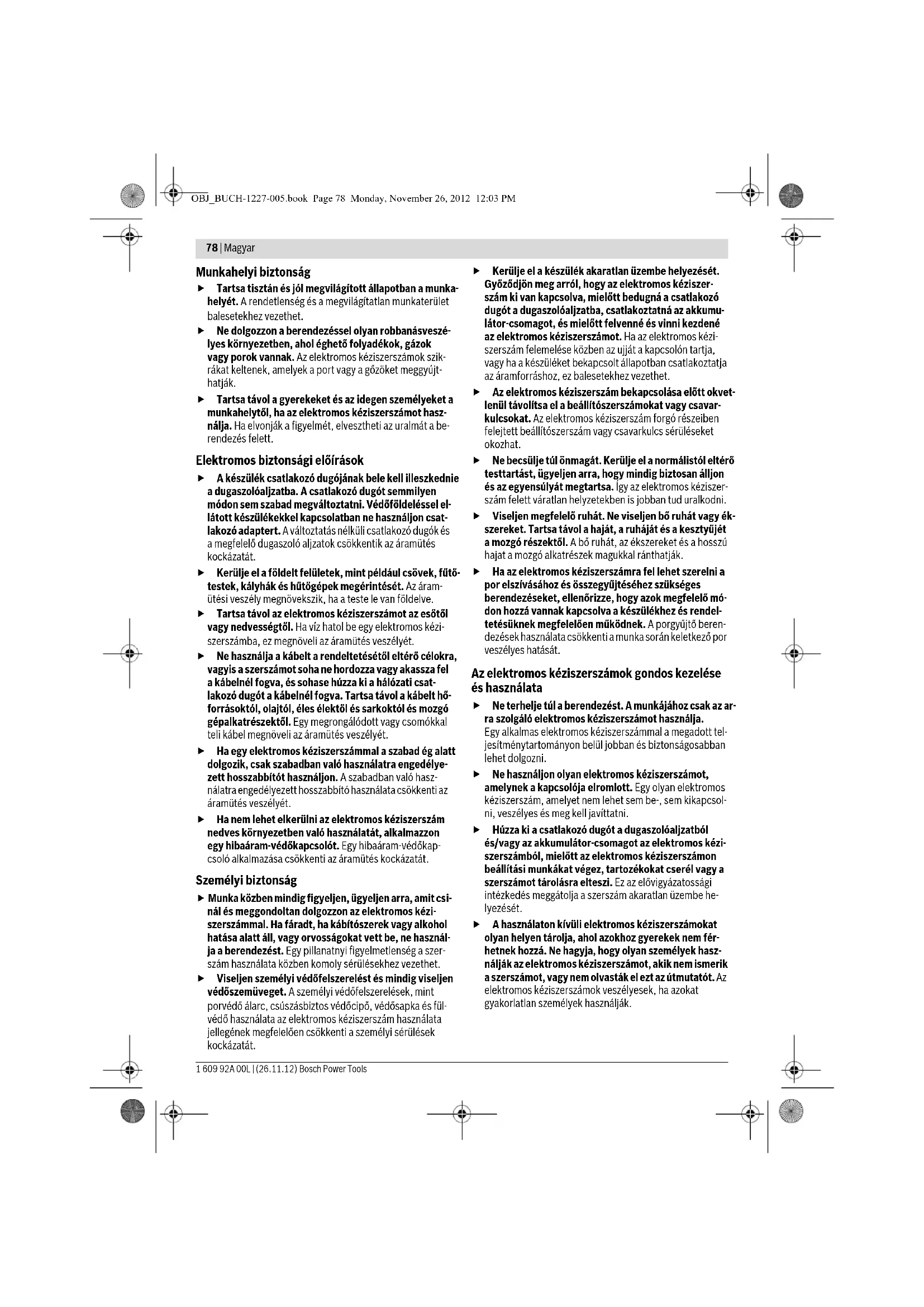 Voľba príslušenstva – 147 FIGYELMEZTETÉS OBJ_BUCH-1227-005.book Page 77 Monday, November 26, 2012 12:03 PM78 | Magyar 1 609 92A 00L | (26.11.12) Bosch Power Tools Munkahelyi biztonság Tartsa tisztán és jól megvilágított állapotban a munka- helyét. A rendetlenség és a megvilágítatlan munkaterület balesetekhez vezethet. Ne dolgozzon a berendezéssel olyan robbanásveszé- lyes környezetben, ahol éghető folyadékok, gázok vagy porok vannak. Az elektromos kéziszerszámok szik- rákat keltenek, amelyek a port vagy a gőzöket meggyújt- hatják. Tartsa távol a gyerekeket és az idegen személyeket a munkahelytől, ha az elektromos kéziszerszámot hasz- nálja. Ha elvonják a figyelmét, elvesztheti az uralmát a be- rendezés felett. Elektromos biztonsági előírások A készülék csatlakozó dugójának bele kell illeszkednie a dugaszolóaljzatba. A csatlakozó dugót semmilyen módon sem szabad megváltoztatni. Védőföldeléssel el- látott készülékekkel kapcsolatban ne használjon csat- lakozó adaptert. A változtatás nélküli csatlakozó dugók és a megfelelő dugaszoló aljzatok csökkentik az áramütés kockázatát. Kerülje el a földelt felületek, mint például csövek, fűtő- testek, kályhák és hűtőgépek megérintését. Az áram- ütési veszély megnövekszik, ha a teste le van földelve. Tartsa távol az elektromos kéziszerszámot az esőtől vagy nedvességtől. Ha víz hatol be egy elektromos kézi- szerszámba, ez megnöveli az áramütés veszélyét. Ne használja a kábelt a rendeltetésétől eltérő célokra, vagyis a szerszámot soha ne hordozza vagy akassza fel a kábelnél fogva, és sohase húzza ki a hálózati csat- lakozó dugót a kábelnél fogva. Tartsa távol a kábelt hő- forrásoktól, olajtól, éles élektől és sarkoktól és mozgó gépalkatrészektől. Egy megrongálódott vagy csomókkal teli kábel megnöveli az áramütés veszélyét. Ha egy elektromos kéziszerszámmal a szabad ég alatt dolgozik, csak szabadban való használatra engedélye- zett hosszabbítót használjon. A szabadban való hasz- nálatra engedélyezett hosszabbító használata csökkenti az áramütés veszélyét. Ha nem lehet elkerülni az elektromos kéziszerszám nedves környezetben való használatát, alkalmazzon egy hibaáram-védőkapcsolót. Egy hibaáram-védőkap- csoló alkalmazása csökkenti az áramütés kockázatát. Személyi biztonság Munka közben mindig figyeljen, ügyeljen arra, amit csi- nál és meggondoltan dolgozzon az elektromos kézi- szerszámmal. Ha fáradt, ha kábítószerek vagy alkohol hatása alatt áll, vagy orvosságokat vett be, ne használ- ja a berendezést. Egy pillanatnyi figyelmetlenség a szer- szám használata közben komoly sérülésekhez vezethet. Viseljen személyi védőfelszerelést és mindig viseljen védőszemüveget. A személyi védőfelszerelések, mint porvédő álarc, csúszásbiztos védőcipő, védősapka és fül- védő használata az elektromos kéziszerszám használata jellegének megfelelően csökkenti a személyi sérülések kockázatát. Kerülje el a készülék akaratlan üzembe helyezését. Győződjön meg arról, hogy az elektromos kéziszer- szám ki van kapcsolva, mielőtt bedugná a csatlakozó dugót a dugaszolóaljzatba, csatlakoztatná az akkumu- látor-csomagot, és mielőtt felvenné és vinni kezdené az elektromos kéziszerszámot. Ha az elektromos kézi- szerszám felemelése közben az ujját a kapcsolón tartja, vagy ha a készüléket bekapcsolt állapotban csatlakoztatja az áramforráshoz, ez balesetekhez vezethet. Az elektromos kéziszerszám bekapcsolása előtt okvet- lenül távolítsa el a beállítószerszámokat vagy csavar- kulcsokat. Az elektromos kéziszerszám forgó részeiben felejtett beállítószerszám vagy csavarkulcs sérüléseket okozhat. Ne becsülje túl önmagát. Kerülje el a normálistól eltérő testtartást, ügyeljen arra, hogy mindig biztosan álljon és az egyensúlyát megtartsa. Így az elektromos kéziszer- szám felett váratlan helyzetekben is jobban tud uralkodni. Viseljen megfelelő ruhát. Ne viseljen bő ruhát vagy ék- szereket. Tartsa távol a haját, a ruháját és a kesztyűjét a mozgó részektől. A bő ruhát, az ékszereket és a hosszú hajat a mozgó alkatrészek magukkal ránthatják. Ha az elektromos kéziszerszámra fel lehet szerelni a por elszívásához és összegyűjtéséhez szükséges berendezéseket, ellenőrizze, hogy azok megfelelő mó- don hozzá vannak kapcsolva a készülékhez és rendel- tetésüknek megfelelően működnek. A porgyűjtő beren- dezések használata csökkenti a munka során keletkező por veszélyes hatását. Az elektromos kéziszerszámok gondos kezelése és használata Ne terhelje túl a berendezést. A munkájához csak az ar- ra szolgáló elektromos kéziszerszámot használja. Egy alkalmas elektromos kéziszerszámmal a megadott tel- jesítménytartományon belül jobban és biztonságosabban lehet dolgozni. Ne használjon olyan elektromos kéziszerszámot, amelynek a kapcsolója elromlott. Egy olyan elektromos kéziszerszám, amelyet nem lehet sem be-, sem kikapcsol- ni, veszélyes és meg kell javíttatni. Húzza ki a csatlakozó dugót a dugaszolóaljzatból és/vagy az akkumulátor-csomagot az elektromos kézi- szerszámból, mielőtt az elektromos kéziszerszámon beállítási munkákat végez, tartozékokat cserél vagy a szerszámot tárolásra elteszi. Ez az elővigyázatossági intézkedés meggátolja a szerszám akaratlan üzembe he- lyezését. A használaton kívüli elektromos kéziszerszámokat olyan helyen tárolja, ahol azokhoz gyerekek nem fér- hetnek hozzá. Ne hagyja, hogy olyan személyek hasz- nálják az elektromos kéziszerszámot, akik nem ismerik a szerszámot, vagy nem olvasták el ezt az útmutatót. Az elektromos kéziszerszámok veszélyesek, ha azokat gyakorlatlan személyek használják. OBJ_BUCH-122