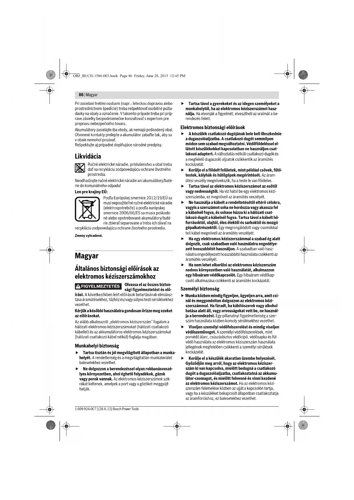 Zapnutie/vypnutie 8 158 Voľba príslušenstva – 159 Cieľ činnosti Obrázok Dodržiavajte nasledovné Strana OBJ_BUCH-1586-003.book Page 85 Friday, June 28, 2013 12:45 PM86 | Magyar 1 609 92A 0C7 | (28.6.13) Bosch Power Tools Pri zasielaní tretími osobami (napr.: leteckou dopravou alebo prostredníctvom špedície) treba rešpektovať osobitné požia- davky na obaly a označenie. V takomto prípade treba pri príp- rave zásielky bezpodmienečne konzultovať s expertom pre prepravu nebezpečného tovaru. Akumulátory zasielajte iba vtedy, ak nemajú poškodený obal. Otvorené kontakty prelepte a akumulátor zabaľte tak, aby sa v obale nemohol posúvať. Rešpektujte aj prípadné doplňujúce národné predpisy. Likvidácia Ručné elektrické náradie, príslušenstvo a obal treba dať na recykláciu zodpovedajúcu ochrane životného prostredia. Neodhadzujte ručné elektrické náradie ani akumulátory/baté- rie do komunálneho odpadu! Len pre krajiny EÚ: Podľa Európskej smernice 2012/19/EÚ sa musí nepoužiteľné ručné elektrické náradie (elektrospotrebiče) a podľa európskej smernice 2006/66/ES sa musia poškode- né alebo opotrebované akumulátory/baté- rie zbierať separovane a treba ich dávať na recykláciu zodpovedajúcu ochrane životného prostredia. Zmeny vyhradené. Magyar Általános biztonsági előírások az elektromos kéziszerszámokhoz Olvassa el az összes bizton- sági figyelmeztetést és elő- írást. A következőkben leírt előírások betartásának elmulasz- tása áramütésekhez, tűzhöz és/vagy súlyos testi sérülésekhez vezethet. Kérjük a későbbi használatra gondosan őrizze meg ezeket az előírásokat. Az alább alkalmazott „elektromos kéziszerszám” fogalom a hálózati elektromos kéziszerszámokat (hálózati csatlakozó kábellel) és az akkumulátoros elektromos kéziszerszámokat (hálózati csatlakozó kábel nélkül) foglalja magában. Munkahelyi biztonság Tartsa tisztán és jól megvilágított állapotban a munka- helyét. A rendetlenség és a megvilágítatlan munkaterület balesetekhez vezethet. Ne dolgozzon a berendezéssel olyan robbanásveszé- lyes környezetben, ahol éghető folyadékok, gázok vagy porok vannak. Az elektromos kéziszerszámok szik- rákat keltenek, amelyek a port vagy a gőzöket meggyújt- hatják. Tartsa távol a gyerekeket és az idegen személyeket a munkahelytől, ha az elektromos kéziszerszámot hasz- nálja. Ha elvonják a figyelmét, elvesztheti az uralmát a be- rendezés felett. Elektromos biztonsági előírások A készülék csatlakozó dugójának bele kell illeszkednie a dugaszolóaljzatba. A csatlakozó dugót semmilyen módon sem szabad megváltoztatni. Védőföldeléssel el- látott készülékekkel kapcsolatban ne használjon csat- lakozó adaptert. A változtatás nélküli csatlakozó dugók és a megfelelő dugaszoló aljzatok csökkentik az áramütés kockázatát. Kerülje el a földelt felületek, mint például csövek, fűtő- testek, kályhák és hűtőgépek megérintését. Az áram- ütési veszély megnövekszik, ha a teste le van földelve. Tartsa távol az elektromos kéziszerszámot az esőtől vagy nedvességtől. Ha víz hatol be egy elektromos kézi- szerszámba, ez megnöveli az áramütés veszélyét. Ne használja a kábelt a rendeltetésétől eltérő célokra, vagyis a szerszámot soha ne hordozza vagy akassza fel a kábelnél fogva, és sohase húzza ki a hálózati csat- lakozó dugót a kábelnél fogva. Tartsa távol a kábelt hő- forrásoktól, olajtól, éles élektől és sarkoktól és mozgó gépalkatrészektől. Egy megrongálódott vagy csomókkal teli kábel megnöveli az áramütés veszélyét. Ha egy elektromos kéziszerszámmal a szabad ég alatt dolgozik, csak szabadban való használatra engedélye- zett hosszabbítót használjon. A szabadban való hasz- nálatra engedélyezett hosszabbító használata csökkenti az áramütés veszélyét. Ha nem lehet elkerülni az elektromos kéziszerszám nedves környezetben való használatát, alkalmazzon egy hibaáram-védőkapcsolót. Egy hibaáram-védőkap- csoló alkalmazása csökkenti az áramütés kockázatát. Személyi biztonság Munka közben mindig figyeljen, ügyeljen arra, amit csi- nál és meggondoltan dolgozzon az elektromos kézi- szerszámmal. Ha fáradt, ha kábítószerek vagy alkohol hatása alatt áll, vagy orvosságokat vett be, ne használ- ja a berendezést. Egy pillanatnyi figyelmetlenség a szer- szám használata közben komoly sérülésekhez vezethet. Viseljen személyi védőfelszerelést és mindig viseljen védőszemüveget. A személyi védőfelszerelések, mint porvédő álarc, csúszásbiztos védőcipő, védősapka és fül- védő használata az elektromos kéziszerszám használata jellegének megfelelően csökkenti a személyi sérülések kockázatát. Kerülje el a készülék akaratlan üzembe helyezését. Győződjön meg arról, hogy az elektromos kéziszer- szám ki van kapcsolva, mielőtt bedugná a csatlakozó dugót a dugaszolóaljzatba, csatlakoztatná az akkumu- látor-csomagot, és mielőtt felvenné és vinni kezdené az elektromos kéziszerszámot. Ha az elektromos kézi- szerszám felemelése közben az ujját a kapcsolón tartja, vagy ha a készüléket bekapcsolt állapotban csatlakoztatja az áramforráshoz, ez balesetekhez vezethet. FIGYELMEZTETÉS OBJ_BUCH-1586-003.book Page 86 Friday, June 28, 2013 12:45 PMMagyar | 87 Bosch Power Tools 1 609 92A 0C7 | (28.6.13) Az elektromos kéziszerszám bekapcsolása előtt okvetle- nül távolítsa el a beállítószerszámokat vagy csavarkul- csokat. Az elektromos kéziszerszám forgó részeiben felej- tett beállítószerszám vagy csavarkulcs sérüléseket okozhat. Ne becsülje túl önmagát. Kerülje el a normálistól eltérő testtartást, ügyeljen arra, hogy mindig biztosan álljon és az egyensúlyát megtartsa. Így az elektromos kéziszer- szám fe