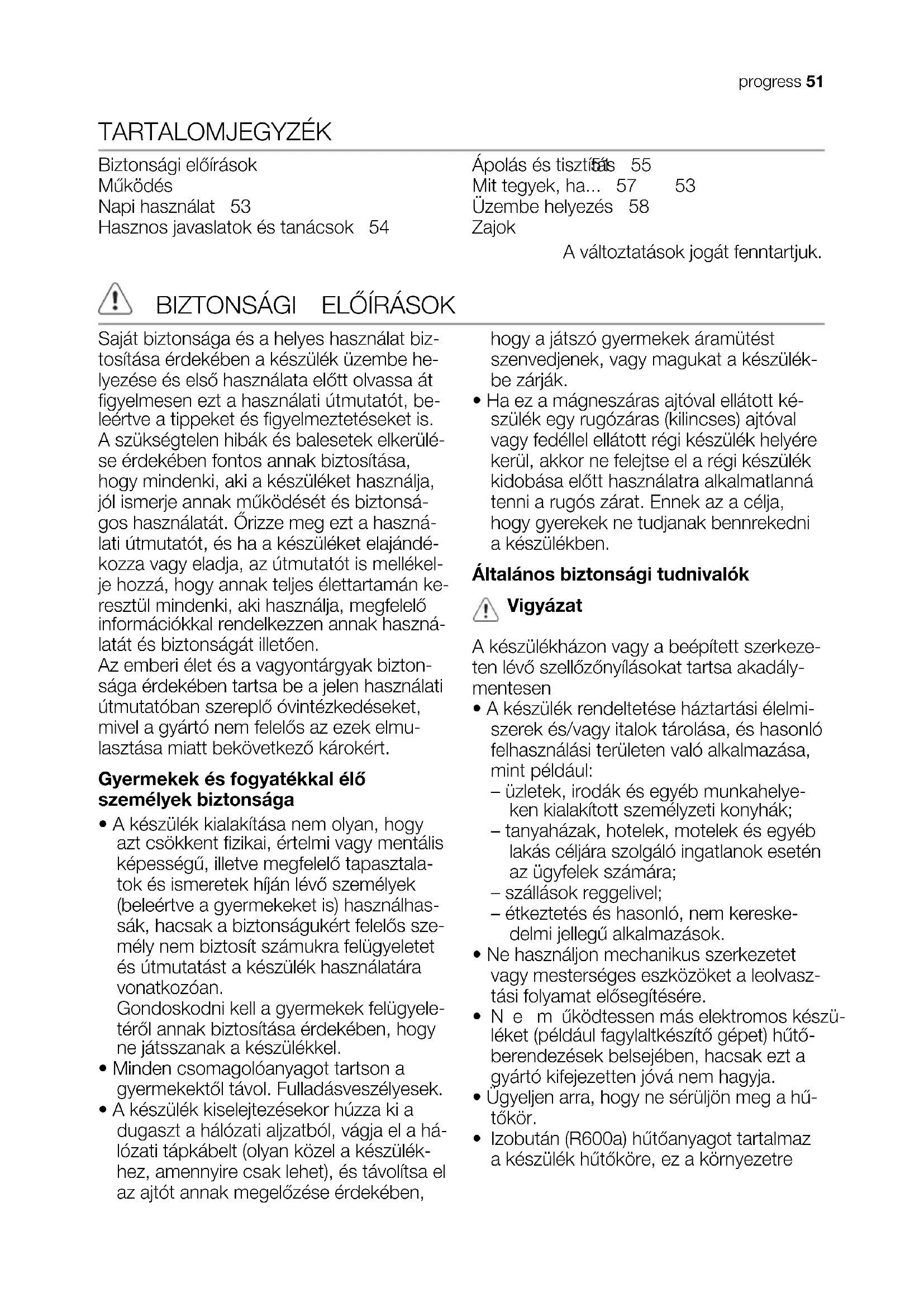 - Izobután (R600a) hűtőanyagot tartalmaz a készülék hűtőköre, ez a környezetre progress 51csekély hatást gyakorló, természetes gáz, amely ugyanakkor gyúlékony. A készülék szállítása és üzembe helyezé- se során bizonyosodjon meg arról, hogy a hűtőkör semmilyen összetevője nem sérült meg. Ha a hűtőkör megsérült: – kerülje nyílt láng és tűzgyújtó eszközök használatát –alaposan szellőztesse ki azt a helyisé- get, ahol a készülék található