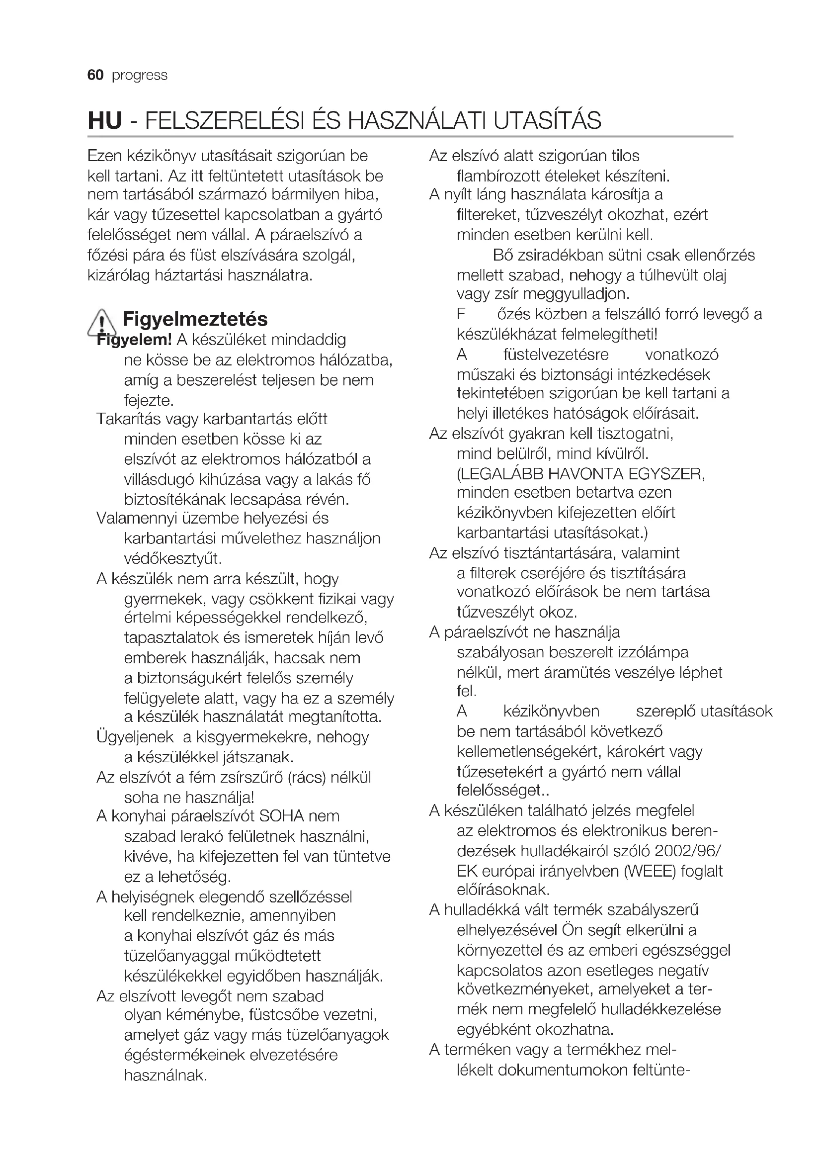 średnia (4.), maksymalna (5.). W przypadku, gdy powietrze w pomieszczeniu kuchennym jest szczególnie zanieczyszczone, należy używać okapu ustawionego na najwyższą prędkość. Zaleca się uruchomienie okapu 5 minut przed przystąpieniem do gotowania jakichkolwiek potraw i pozostawienie go włączonym jeszcze przez ok. 15 minut po zakończeniu gotowania. Konserwacja Uwaga! Przed wykonaniem jakiejkolwiek czynności czyszczenia lub konserwacji należy odłączyć okap od zasilania wyjmując wtyczkę z gniazdka lub wyłączając główny wyłącznik zasilania. Okap należy często czyścić, tak wewnątrz jak i na zewnątrz (przynajmniej z tą samą częstotliwością, z którą wykonuje się czyszczenie fi ltrów tłuszczowych) przy użyciu szmatki nawilżonej łagodnymi środkami. Nie należy używać środków ściernych. NIE STOSOWAĆ ALKOHOLU! Uwaga: Nieprzestrzeganie przepisów dotyczących czyszczenia urządzenia i wymiany filtrów powoduje powstanie zagrożenia pożarem. Zaleca się zatem przestrzeganie podanych wskazówek. Producent nie ponosi żadnej odpowiedzialności za ewentualne uszkodzenia silnika lub pożary wynikające z nieprzestrzegania zasad konserwacji oraz wzmiankowanych wyżej instrukcji. Filtr przeciwtłuszczowy Rys. 1-17 Musi być czyszczony co najmniej raz w miesiącu, za pomocą środka czyszczącego nie żrącego, ręcznie lub w zmywarce w niskiej temperaturze i krótkim cyklu mycia. Mycie w zmywarce metalowego fi ltra tłuszczowego może spowodować jego nieznaczne odbarwienie, to jednak nie pogarsza parametrów jego pracy. Filtr na węgiel (tylko dla wersji fi ltrującej) Rys. 16 Type 20 LONG LIFE - Filtr węglowy nadający się do mycia Filtr węglowy może być myty co dwa miesiące w gorącej wodzie z odpowiednimi detergentami lub w zmywarce w temperaturze 65°( w wypadku mycia w zmywarce zastosować cykl pełny bez naczyń w zmywarce ). Nadmiar wody należy ostrożnie usunąć, tak aby nie uszkodzić fi ltra, potem wyjąć wkład znajdujący się wewnątrz osłony plastikowej i włożyć go do piekarnika na dziesięć minut w temperaturze 100° aby wysuszyć go całkowicie. Wkład należy wymieniać co trzy lata lub za każdym razem gdy materiał jest uszkodzony. Type 15 - Filtr węglowy NIE nadający się do mycia. Nasycenie fi ltra następuje po krótszym lub dłuższym okresie użytkowania w zależności od rodzaju kuchni i od regularności z jaką jest wykonywane czyszczenie fi ltra tłuszczowego. Wkład fi ltra powinien być w każdym razie wymieniony po upływie nie więcej niż czterech miesięcy. NIE wolno myć lub regenerować fi ltra.progress 59 Wymiana lampek Rys. 18 Przed przystąpieniem do jakichkolwiek operacji związanych z konserwacją urządzenia, należy odłączyć okap od zasilania energią elektryczną. Uwaga! Nie dotykać żarówek dopóki są gorące. Należy stosować wyłącznie żarówki halo- genowe o maksymalnej mocy 20 W - 12 V - G4. Nie należy dotykać żarówek rękami.60 progress HU - FELSZERELÉSI ÉS HASZNÁLATI UTASÍTÁS Ezen kézikönyv utasításait szigorúan be kell tartani. Az itt feltüntetett utasítások be nem tartásából származó bármilyen hiba, kár vagy tűzesettel kapcsolatban a gyártó felelősséget nem vállal. A páraelszívó a főzési pára és füst elszívására szolgál, kizárólag háztartási használatra. Figyelmeztetés Figyelem! A készüléket mindaddig ne kösse be az elektromos hálózatba, amíg a beszerelést teljesen be nem fejezte. Takarítás vagy karbantartás előtt minden esetben kösse ki az elszívót az elektromos hálózatból a villásdugó kihúzása vagy a lakás fő biztosítékának lecsapása révén. Valamennyi üzembe helyezési és karbantartási művelethez használjon védőkesztyűt. A készülék nem arra készült, hogy gyermekek, vagy csökkent fizikai vagy értelmi képességekkel rendelkező, tapasztalatok és ismeretek híján levő emberek használják, hacsak nem a biztonságukért felelős személy felügyelete alatt, vagy ha ez a személy a készülék használatát megtanította. Ügyeljenek a kisgyermekekre, nehogy a készülékkel játszanak. Az elszívót a fém zsírszűrő (rács) nélkül soha ne használja! A konyhai páraelszívót SOHA nem szabad lerakó felületnek használni, kivéve, ha kifejezetten fel van tüntetve ez a lehetőség. A helyiségnek elegendő szellőzéssel kell rendelkeznie, amennyiben a konyhai elszívót gáz és más tüzelőanyaggal működtetett készülékekkel egyidőben használják. Az elszívott levegőt nem szabad olyan kéménybe, füstcsőbe vezetni, amelyet gáz vagy más tüzelőanyagok égéstermékeinek elvezetésére használnak. Az elszívó alatt szigorúan tilos flambírozott ételeket készíteni. A nyílt láng használata károsítja a filtereket, tűzveszélyt okozhat, ezért minden esetben kerülni kell. Bő zsiradékban sütni csak ellenőrzés mellett szabad, nehogy a túlhevült olaj vagy zsír meggyulladjon. Főzés közben a felszálló forró levegő a készülékházat felmelegítheti! A füstelvezetésre vonatkozó műszaki és biztonsági intézkedések tekintetében szigorúan be kell tartani a helyi illetékes hatóságok előírásait. Az elszívót gyakran kell tisztogatni, mind belülről, mind kívülről. (LEGALÁBB HAVONTA EGYSZER, minden esetben betartva ezen kézikönyvben kifejezetten előírt karbantartási utasításokat.) Az elszívó tisztántartására, valamint a filterek cseréjére és tisztítására vonatkozó előírások be nem tartása tűzveszélyt okoz. A páraelszívót ne használja szabályosan beszerelt izzólámpa nélkül, mert áramütés veszélye léphet fel. A kézikönyvben szereplő utasítások be nem tartásából következő kellemetlenségekért, károkért vagy tűzesetekért a gyártó nem vállal felelősséget.. A készüléken található jelzés megfelel az elektromos és elektronikus beren- dezések hulladékairól szóló 2002/96