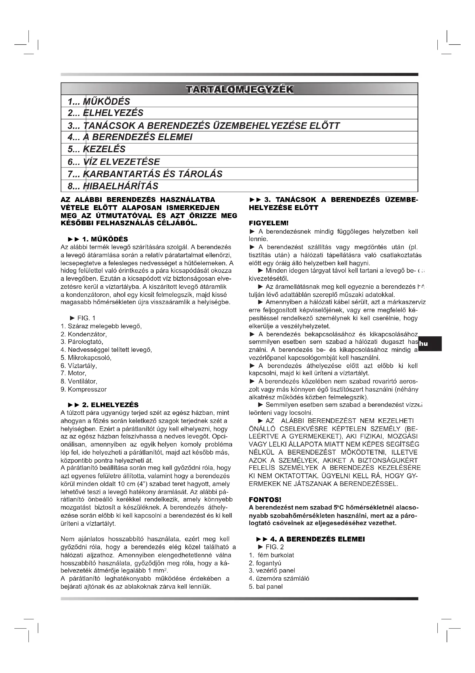Az alábbi termék levegő szárítására szolgál. A berendezés a levegő átáramlása során a relatív páratartalmat ellenőrzi, lecsepegtetve a felesleges nedvességet a hűtőelemeken. A hideg felülettel való érintkezés a pára kicsapódását okozza a levegőben. Ezután a kicsapódott víz biztonságosan elve- zetésre kerül a víztartályba. A kiszárított levegő átáramlik a kondenzátoron, ahol egy kicsit felmelegszik, majd kissé magasabb hőmérsékleten újra visszaáramlik a helyiségbe. ► FIG. 1
