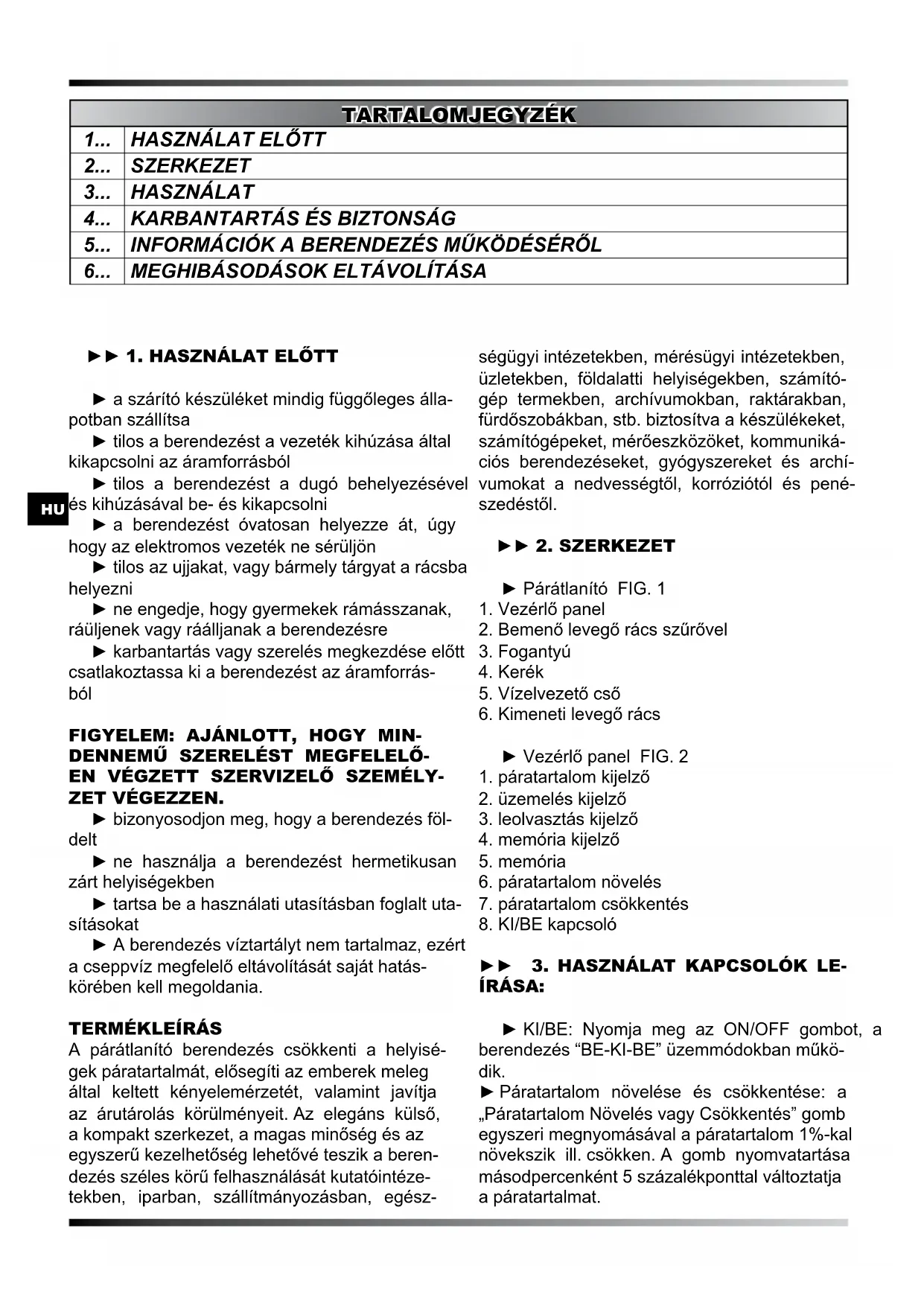 ZET VÉGEZZEN. ► bizonyosodjon meg, hogy a berendezés föl- delt ► ne használja a berendezést hermetikusan zárt helyiségekben ► tartsa be a használati utasításban foglalt uta- sításokat ► A berendezés víztartályt nem tartalmaz, ezért a cseppvíz megfelelő eltávolítását saját hatás- körében kell megoldania. TERMÉKLEÍRáS A párátlanító berendezés csökkenti a helyisé- gek páratartalmát, elősegíti az emberek meleg által keltett kényelemérzetét, valamint javítja az árutárolás körülményeit. Az elegáns külső, a kompakt szerkezet, a magas minőség és az egyszerű kezelhetőség lehetővé teszik a beren- dezés széles körű felhasználását kutatóintéze- tekben, iparban, szállítmányozásban, egész- ségügyi intézetekben, mérésügyi intézetekben, üzletekben, földalatti helyiségekben, számító- gép termekben, archívumokban, raktárakban, fürdőszobákban, stb. biztosítva a készülékeket, számítógépeket, mérőeszközöket, kommuniká- ciós berendezéseket, gyógyszereket és archí- vumokat a nedvességtől, korróziótól és pené- szedéstől. ► 2. SZERKEZET ► Párátlanító FIG. 1