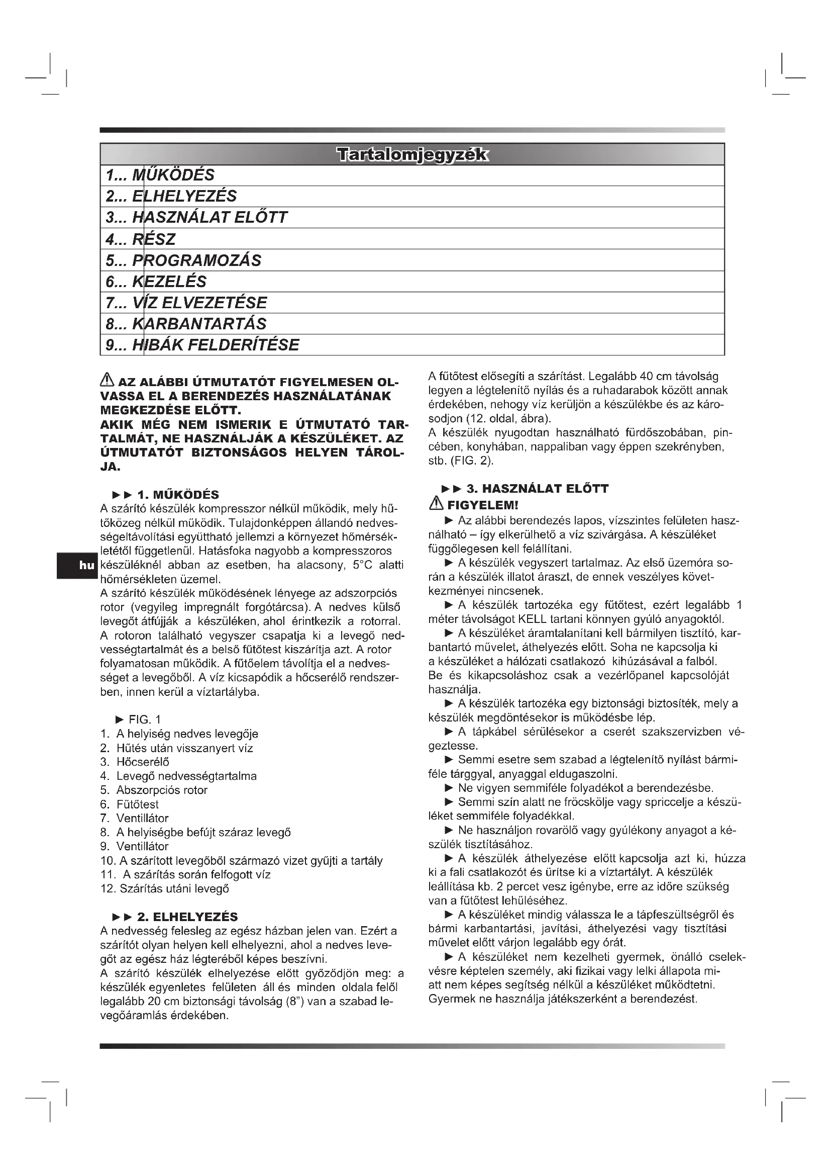VÖRÖS színnel világít, ha a víztartály megtelik vagy a tartály dőlésszöge nem megfelelő.► 6. KEZELÉS ► Megfelelő hálózati csatlakozó aljzatba kösse a készü- léket (Nézze meg a készülék névleges adatait tartalmazó táblázatot). ► Nyomja meg a TÁPFESZÜLTSÉG gombot ezzel kap- csolja be a készüléket. A berendezés folyamatos üzem- ben működik. ► Nyomja meg a HUMITIDY (NEDVESSÉG) gombot, mellyel beállíthatja a kívánt nedvességtartalom értéket: folyamatos üzem, 40%, 50%, 60% vagy 70%. ► Nyomja meg a MODE gombot, ezzel választ szellő- zési sebességet, CSENDES, TURBO vagy SZÁRÍTÓ üzemmód. ► Nyomja meg a TIMER gombot, ezzel állítható be az üzemidő (1~24 óra). ► A készülék kikapcsolásához ismét nyomja meg a TÁP- FESZÜLTSÉG gombot. FONTOS! ► A készülék kikapcsolása után a berendezés még leg- alább 2 percig működik, ennyi idő szükséges a fűtőtest ki- hűléséhez. A hűtési folyamat során a tápfeszültség lámpa gyelmeztetően villog. NE HÚZZA KI A FALI DUGASZOLÓ ALJAZATBÓL A CSATLAKOZÓT A GYORS LEÁLLÍTÁS ÉRDE- KÉBEN ► Ne indítsa el a készüléket a LÉGSZŰRŐ nélkül ► A biztonság érdekében 8 óra folyamatos üzem után legalább 2 percre állítsa le a készüléket. Ezt követően ismét bekapcsolhatja függetlenül attól, hogy a beállított idő letelt-e vagy sem. Az üzemszünet alatt a ventillátor működik, így vezeti el a levegőt a készülékből. A készülék kikapcsolását a POWER gombbal végezze (a beállított időérték törlődik). Ha a víztartály megtelik, a beállított idő- érték is törlődik. Ha időérték nem lett beállítva, a készülék 24 óra múltán önműködően kikapcsol. ► RUHASZÁRÍTÁS üzemmódban a készülék függőlege- sen álljon és távolsága legalább 40 cm legyen a szárított tárgytól (ruhától). Győződjön meg arról, hogy a légtelenítő nyílásba nem került víz. Legyen gyelemmel a használati útmutatóban leírt biztonsági távolságok betartására min- den irányban! (FIG. 8). ► A készülék túlmelegedés ellen olvadó biztosítékkal rendelkezik. A készülék megdőlésekor önműködően ki- kapcsolódik. A TÁPFESZÜLTSÉG kijelző VÖRÖS színnel világít és háromszoros hangjelzést ad a berendezés nem megfelelő dőlésszög esetén. A készülék helyes visszaál- lítását követően az ismételt indítás a TÁPFESZÜLTSÉG gombbal történik. ► Automatikus önvizsgálat: Ha a szobai érzékelő, a nedvesség vagy dőlésérzékelő nem működik, akkor a ké- szülék háromszori hangjelzést ad, a TÁPFESZÜLTSÉG jelzőlámpa színe VÖRÖS színre vált és a készülék leáll.