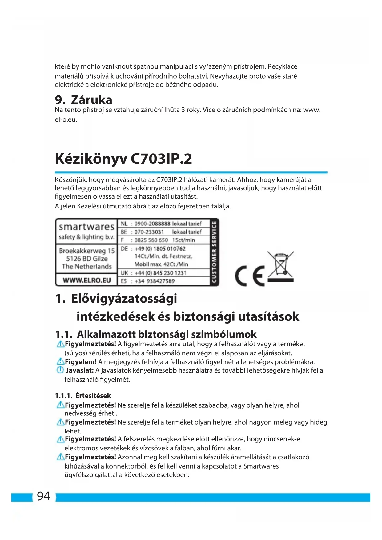 Na tento přístroj se vztahuje záruční lhůta 3 roky. Více o záručních podmínkách na: www. elro.eu. Kézikönyv C703IP.2 Köszönjük, hogy megvásárolta az C703IP.2 hálózati kamerát. Ahhoz, hogy kameráját a lehető leggyorsabban és legkönnyebben tudja használni, javasoljuk, hogy használat előtt gyelmesen olvassa el ezt a használati utasítást. A jelen Kezelési útmutató ábráit az előző fejezetben találja.