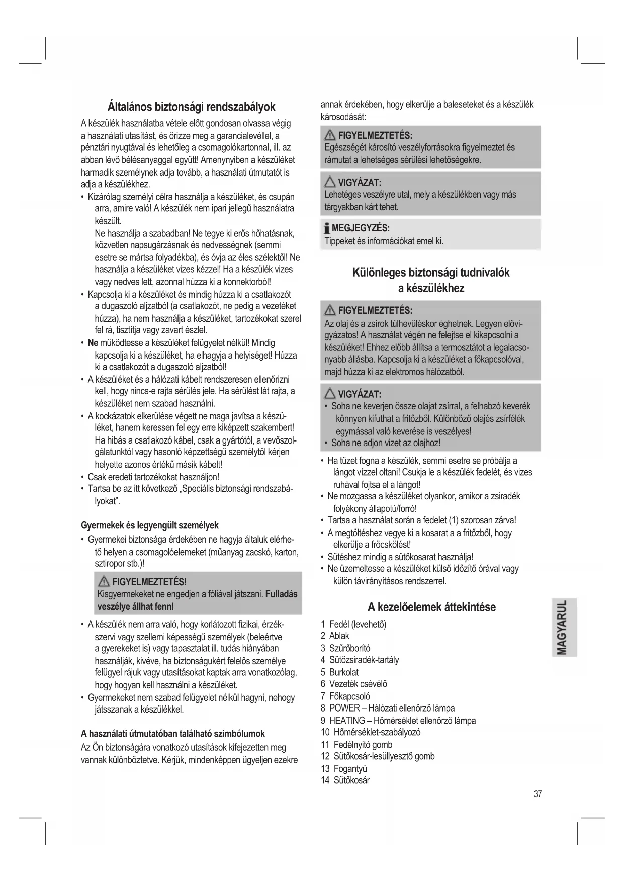 1 Fedél (levehető) 2 Ablak 3 Szűrőborító 4 Sütőzsiradék-tartály 5 Burkolat 6 Vezeték csévélő 7 Főkapcsoló 8 POWER – Hálózati ellenőrző lámpa 9 HEATING – Hőmérséklet ellenőrző lámpa 10 Hőmérséklet-szabályozó 11 Fedélnyitó gomb 12 Sütőkosár-lesüllyesztő gomb 13 Fogantyú 14 Sütőkosár38 Bevezetés Ez a fritőz szabályozható termosztáttal van ellátva, ami lehető- vé teszi, hogy a hőmérséklet egyedileg hozzáigazítható legyen az elkészítendő ételhez.