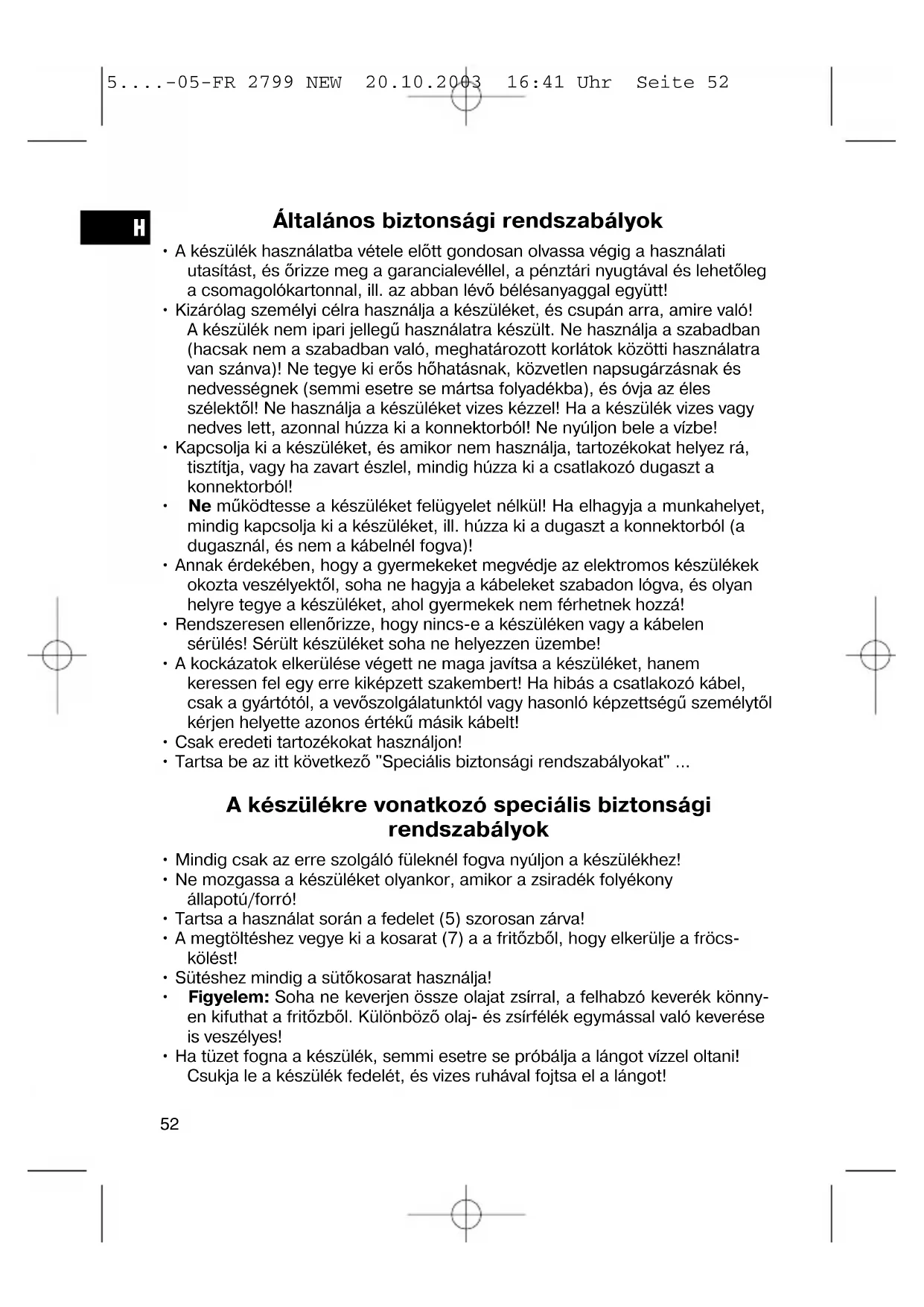 5....-05-FR 2799 NEW 20.10.2003 16:41 Uhr Seite 52Bevezetés Ez a fritőz szabályozható termosztáttal van ellátva, ami lehetővé teszi, hogy a hőmérséklet egyedileg hozzáigazítható legyen az elkészítendő ételhez. Kérem, olvassa végig gondosan a jelen használati utasítást, hogy a fritőzt optimálisan és biztonságosan tudja használni. Csatlakoztatás A készüléket csak előírásszerűen szerelt, 230 V 50 Hz-es földelt konnektorba szabad csatlakoztatni. Üzembehelyezés Az első használatvétel előtt