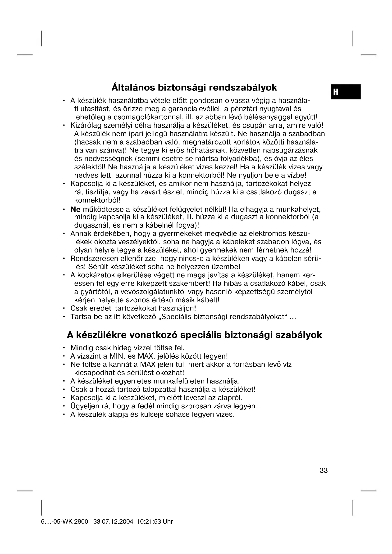 Tartsa be az itt kovetkezö „SpecialisBiztonsagi rendszabályokat“ ...