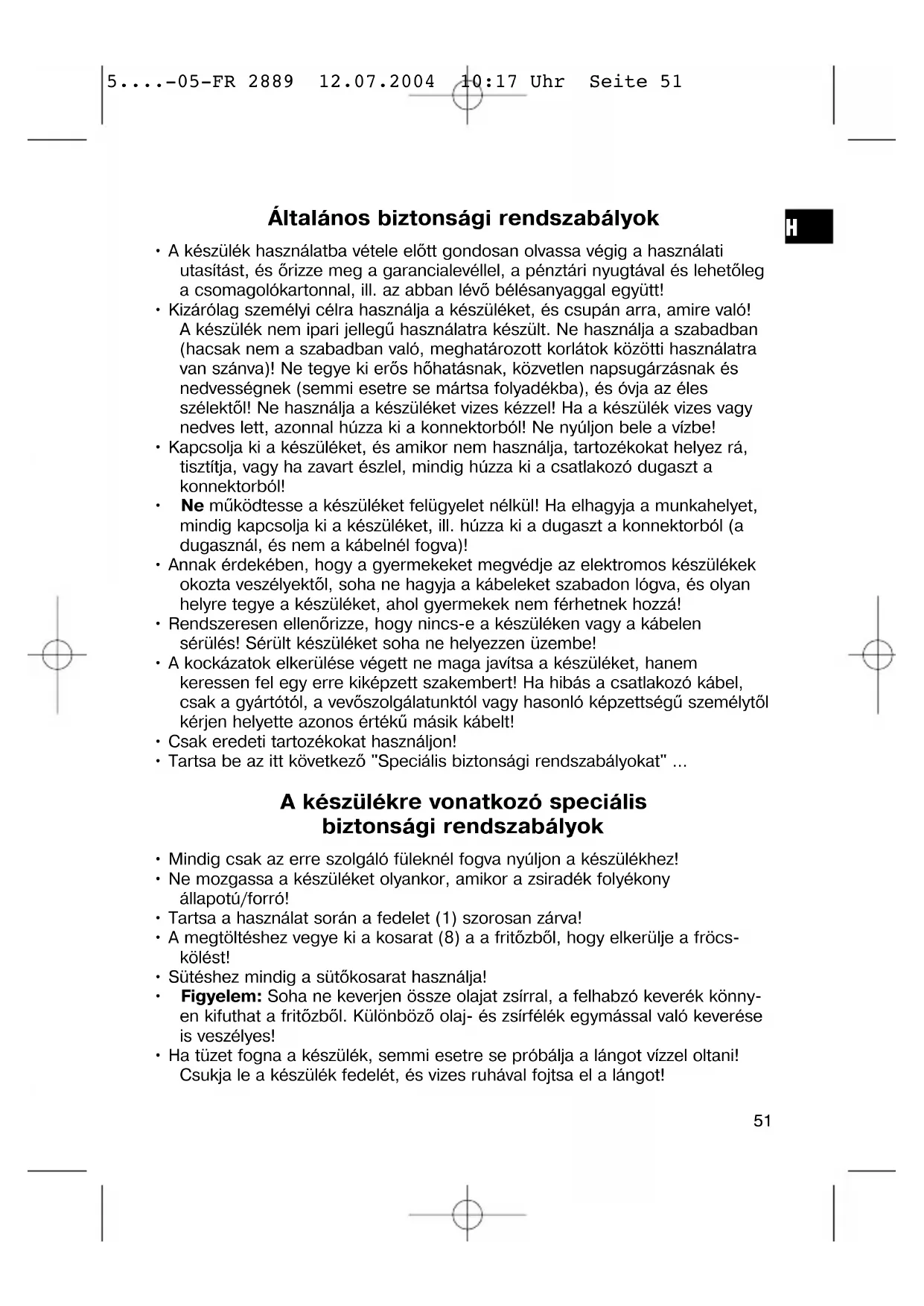 5....-05-FR 2889 12.07.2004 10:17 Uhr Seite 51A kezelőelemek áttekintése Bevezetés Ez a fritőz szabályozható termosztáttal van ellátva, ami lehetővé teszi, hogy a hőmérséklet egyedileg hozzáigazítható legyen az elkészítendő ételhez. Kérem, olvassa végig gondosan a jelen használati utasítást, hogy a fritőzt optimálisan és biztonságosan tudja használni. Csatlakoztatás A készüléket csak előírásszerűen szerelt, 230 V 50 Hz-es földelt konnektorba szabad csatlakoztatni. Üzembehelyezés Az első használatvétel előtt