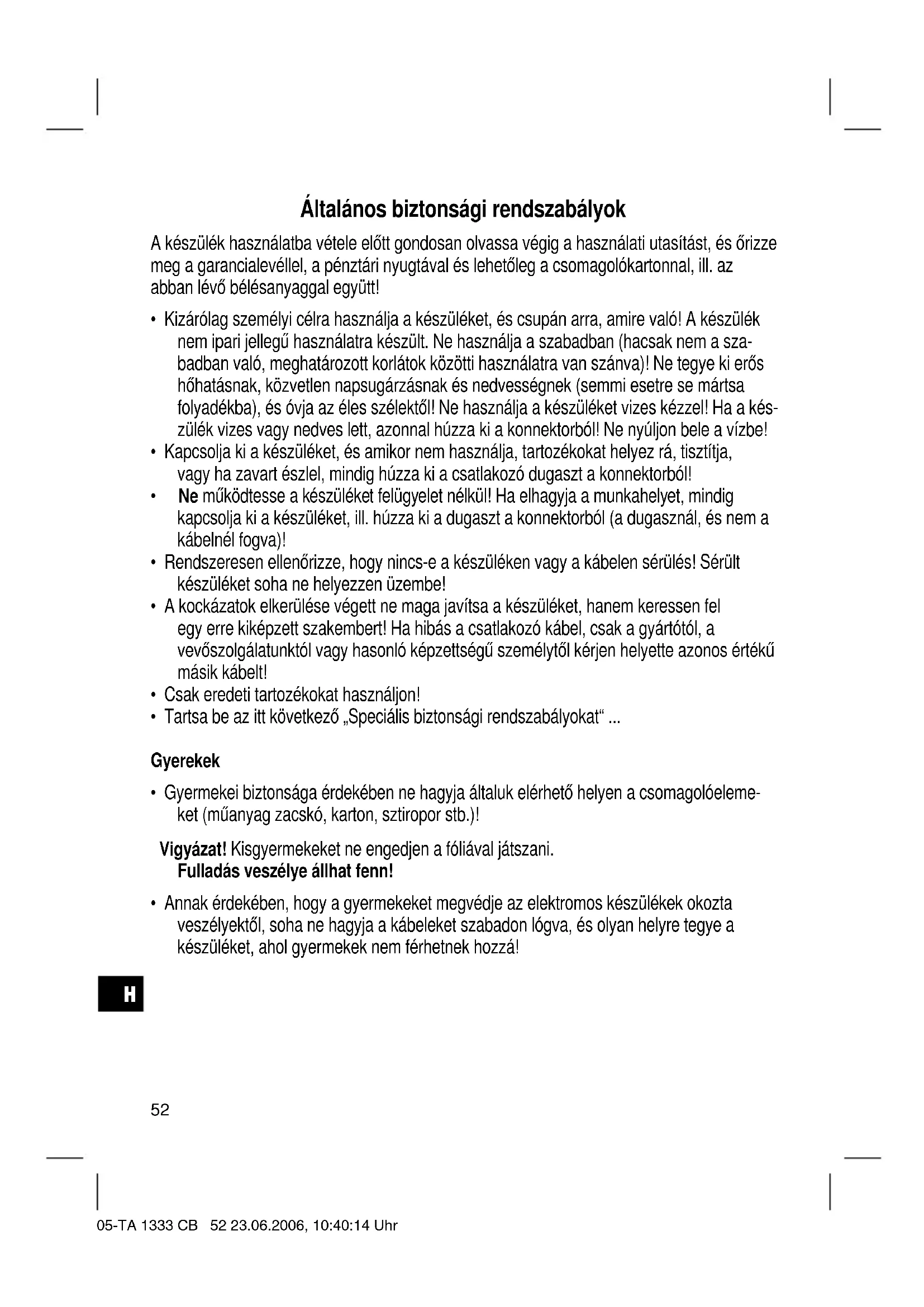 - Kizárolag személyi celra használaj a keszüléket, és csupán arra, amire való! A keszülék nem ipari jellegú használatra keszült. Ne használaj a szabadban (hacsak nem a szabadban való, meghatározott korlátok kozötti használatra van szánva)! Ne tegye ki erős hóhatásnak, közvetlen napsugárzásnak és nedvességnek (semmi esetre se martsa folyadékba), és ovja az éles szélektő! Ne használaj a keszüléket vizes kézzell! Ha a keszülék vizes vagy nedveslett, azonnal húzza ki a konnektörból! Ne nyúljon bele a vizbe!