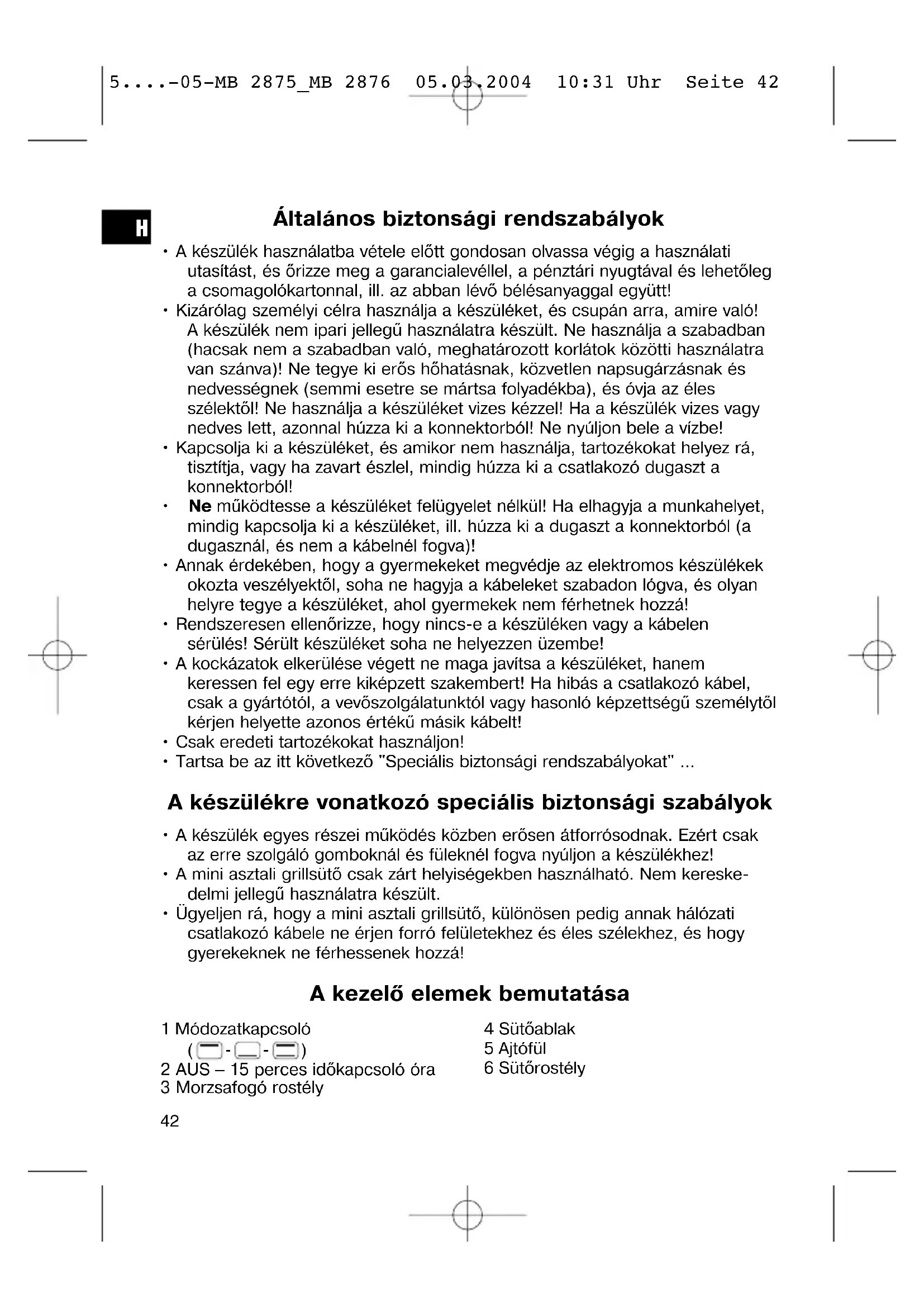 2 AUS – 15 perces időkapcsoló óra 3 Morzsafogó rostély 4 Sütőablak 5 Ajtófül 6 Sütőrostély 5....-05-MB 2875_MB 2876 05.03.2004 10:31 Uhr Seite 42Kezelés