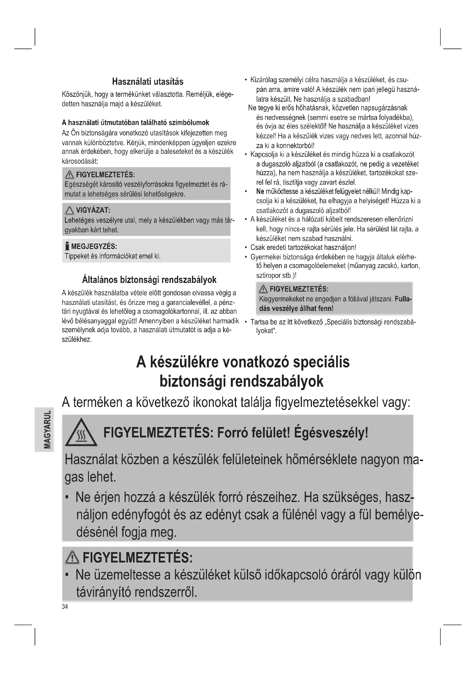 Usuwanie Znaczenie symbolu „Pojemnik na śmieci“ Proszę oszczędzać nasze środowisko, sprzęt elektryczny nie należy do śmieci domowych. Proszę korzystać z punktów zbiorczych, przewidzianych do zdawania sprzętu elektrycznego, i tam proszę oddawać sprzęt elektryczny, którego już nie będą Państwo używać. Tym sposobem pomagają Państwo unikać potencjalnych na- stępstw niewłaściwego usuwania odpadów, mających wpływ na środowisko i zdrowie ludzi. Tą drogą przyczyniają się Państwo do ponownego użycia, do recyklingu i do innych form wykorzystania starego sprzętu elek- trycznego i elektronicznego. Informacje, gdzie można zdać sprzęt, otrzymają Państwo w swoich urzędach komunalnych lub w administracji gminy.34 Használati utasítás Köszönjük, hogy a termékünket választotta. Reméljük, elége- detten használja majd a készüléket. A használati útmutatóban található szimbólumok Az Ön biztonságára vonatkozó utasítások kifejezetten meg vannak különböztetve. Kérjük, mindenképpen ügyeljen ezekre annak érdekében, hogy elkerülje a baleseteket és a készülék károsodását: FIGYELMEZTETÉS: Egészségét károsító veszélyforrásokra gyelmeztet és rá- mutat a lehetséges sérülési lehetőségekre. VIGYÁZAT: Lehetéges veszélyre utal, mely a készülékben vagy más tár- gyakban kárt tehet. MEGJEGYZÉS: Tippeket és információkat emel ki. Általános biztonsági rendszabályok A készülék használatba vétele előtt gondosan olvassa végig a használati utasítást, és őrizze meg a garancialevéllel, a pénz- tári nyugtával és lehetőleg a csomagolókartonnal, ill. az abban lévő bélésanyaggal együtt! Amennyiben a készüléket harmadik személynek adja tovább, a használati útmutatót is adja a ké- szülékhez.