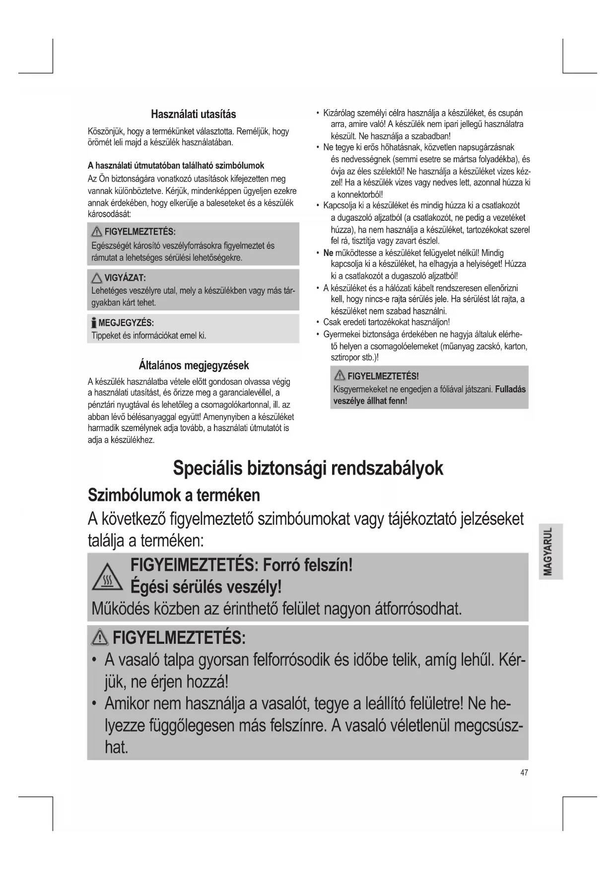 - A vasaló talpa gyorsan felforrósodik és időbe telik, amíg lehűl. Kér- jük, ne érjen hozzá!