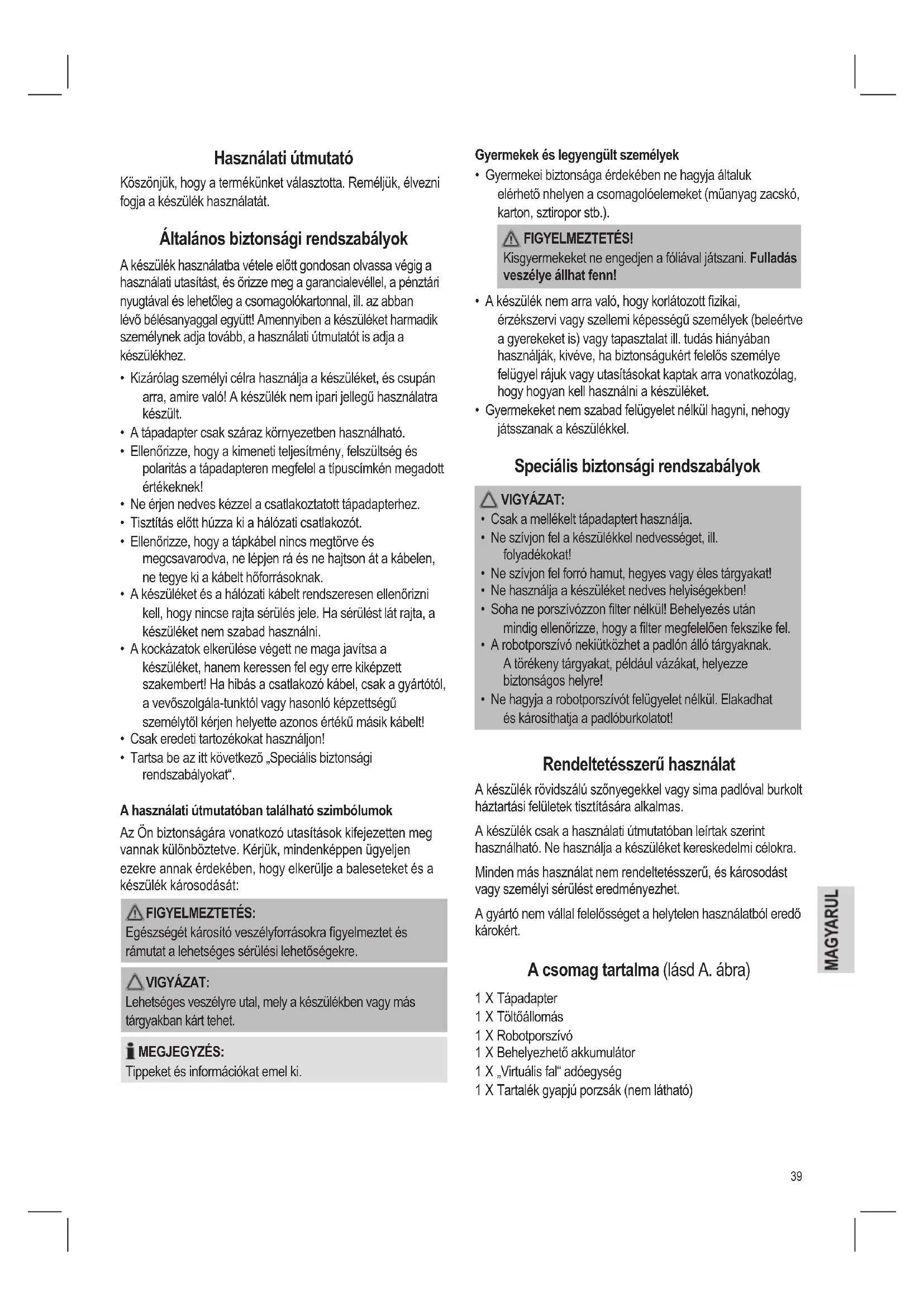 - Ne hagyja a robotporszívót felügyelet nélkül. Elakadhat és károsíthatja a padlóburkolatot! Rendeltetésszerű használat A készülék rövidszálú szőnyegekkel vagy sima padlóval burkolt háztartási felületek tisztítására alkalmas. A készülék csak a használati útmutatóban leírtak szerint használható. Ne használja a készüléket kereskedelmi célokra. Minden más használat nem rendeltetésszerű, és károsodást vagy személyi sérülést eredményezhet. A gyártó nem vállal felelősséget a helytelen használatból eredő károkért. A csomag tartalma (lásd A. ábra) 1 X Tápadapter 1 X Töltőállomás 1 X Robotporszívó 1 X Behelyezhető akkumulátor 1 X „Virtuális fal“ adóegység 1 X Tartalék gyapjú porzsák (nem látható)40 A készülék kicsomagolása